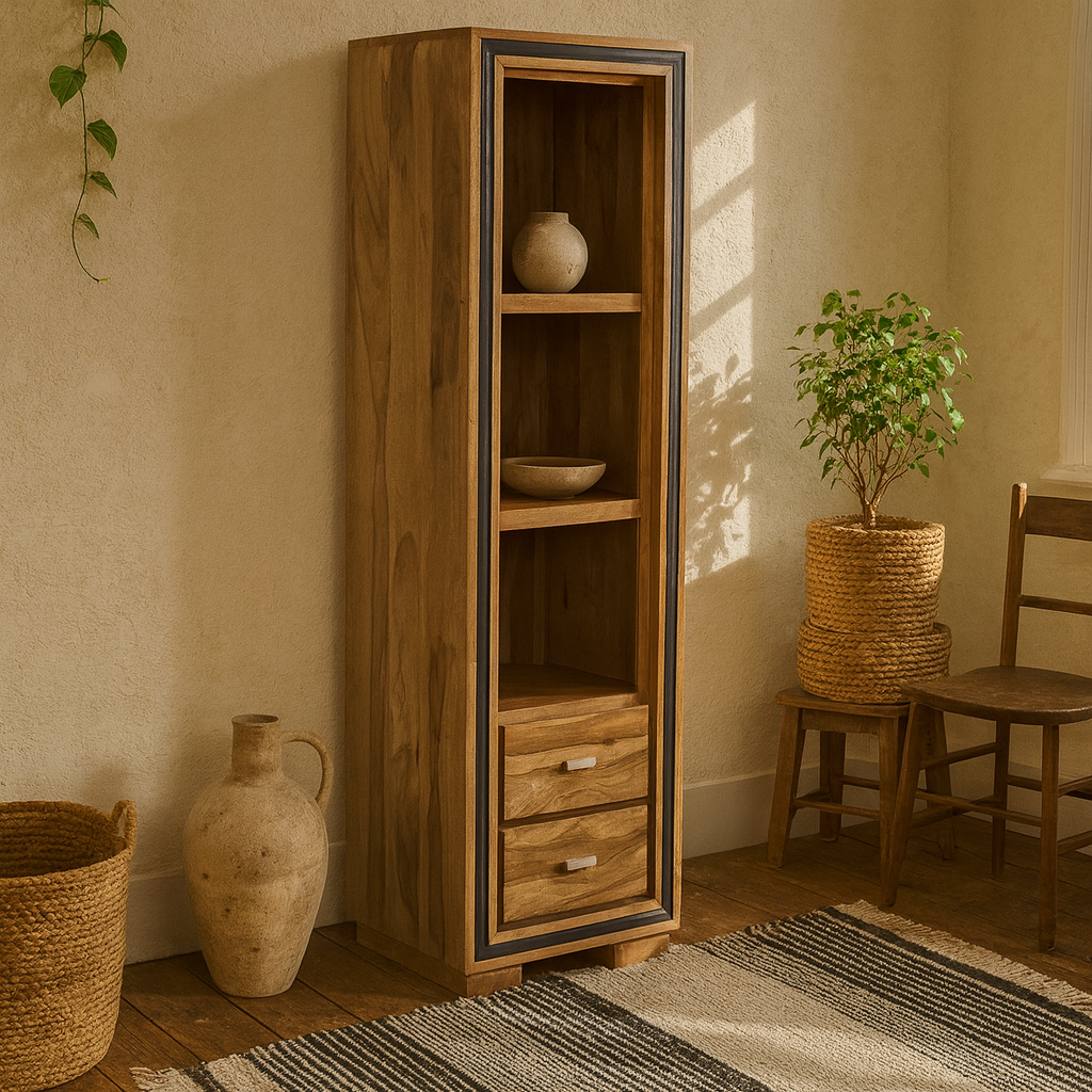 This slim bookcase brings warm natural character to any room, crafted from A-grade sheesham hardwood renowned for its rich grain patterns and deep, earthy tones. The tall, narrow silhouette makes it ideal for smaller spaces, adding vertical storage without overwhelming the room. Clean modern lines combine beautifully with the organic beauty of solid wood, giving the piece a refined yet inviting presence.
