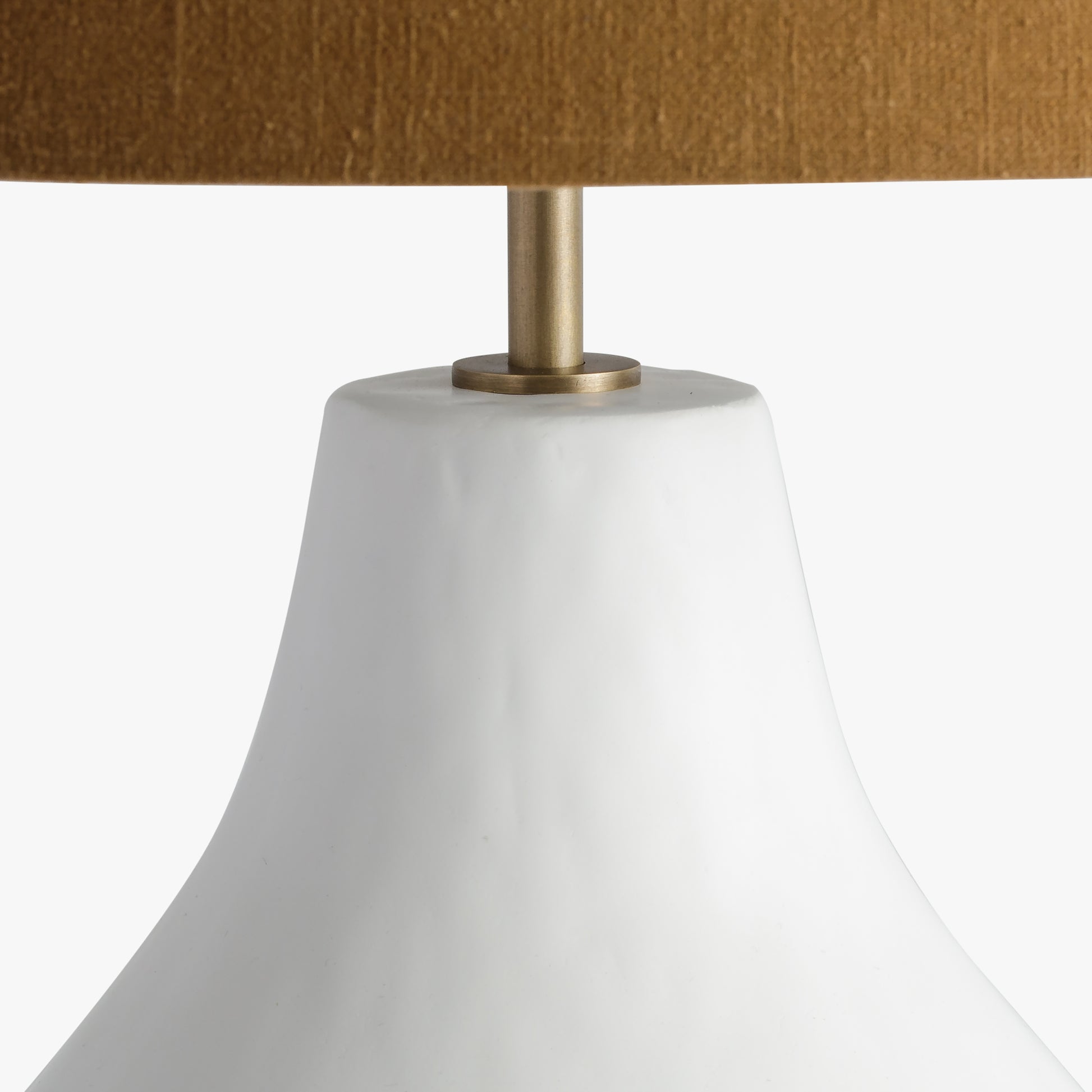 Elegant and organic, this piece blends natural texture with sculptural form. The smooth white ceramic base has a subtly handcrafted feel, while the ochre linen shade casts a soft, golden glow. Its rounded silhouette adds warmth and balance, making it a perfect centrepiece for both modern and classic interiors.