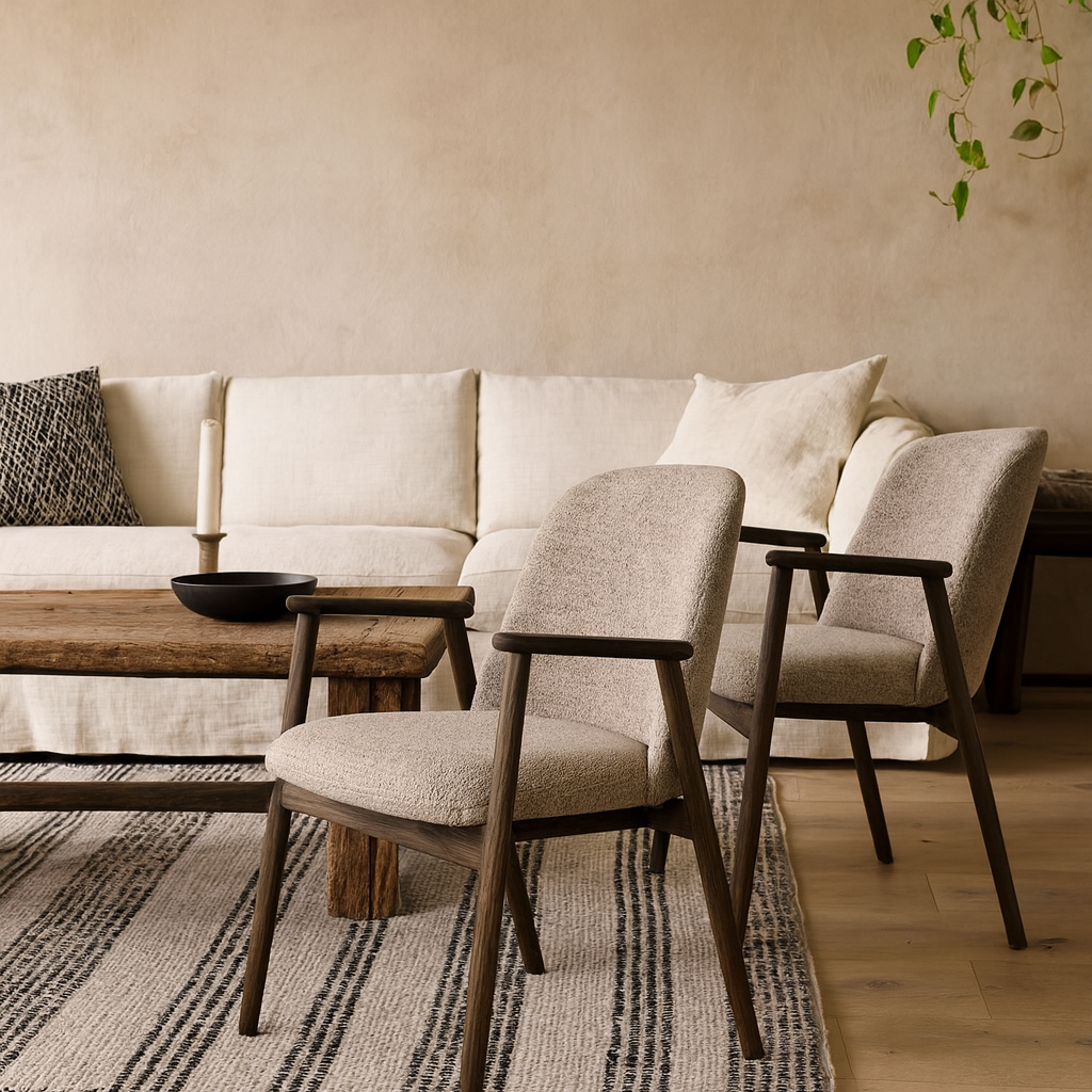 This set of 2 dining chairs bring a soft Nordic inspired calm to any space, blending modern organic style with gently curved lines and a warm, neutral palette. The cosy beige upholstery creates an inviting atmosphere around a dining table, in a relaxed reading corner or beside a desk, adding understated elegance without demanding attention. Its sculpted armrests and supportive shape make every sitting moment feel comfortable and considered, turning ordinary meals and quiet evenings into something a little more special.