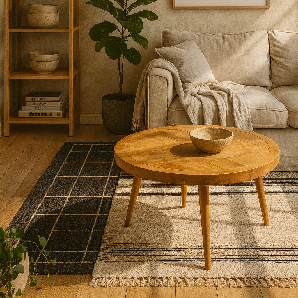 This round coffee table brings a soft contemporary glow to any living room, blending the natural warmth of mango wood with refined metallic detailing. The light natural finish highlights gentle grain patterns, while the gold metal inlays across the tabletop add a subtle touch of elegance. A matching gold metal frame surrounds the edge, giving the piece a polished, sculptural look that feels both modern and timeless.
