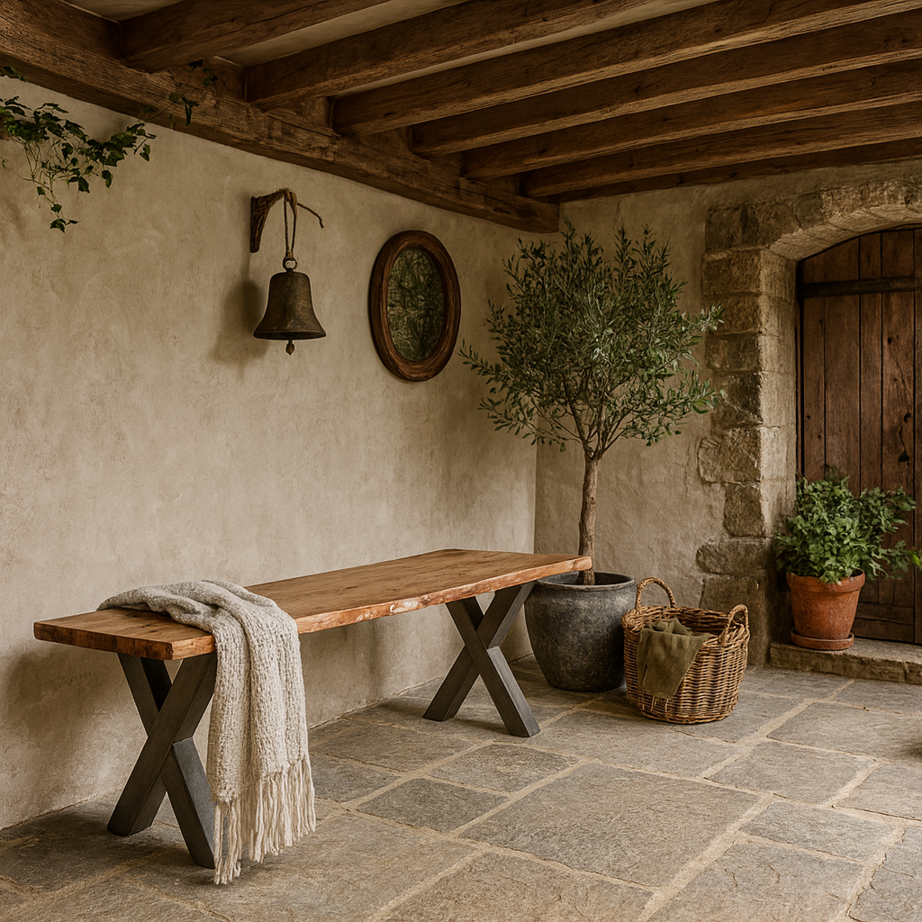 Resting on sturdy black metal X-frame legs, it brings durability and an industrial touch to the design. Perfect as seating for a dining table, in a hallway, or as a statement piece at the foot of a bed, it offers versatility while elevating modern-rustic interiors.
