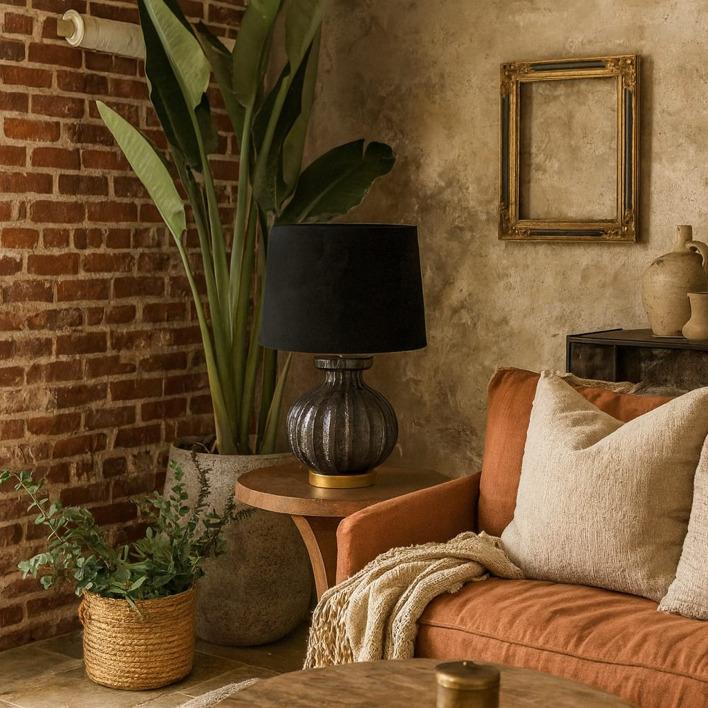 A fluted glass base catches and bends the light, creating a play of shadow and shine that feels quietly dramatic. Paired with a luxe black velvet shade, it strikes a balance between sculptural form and refined sophistication.
