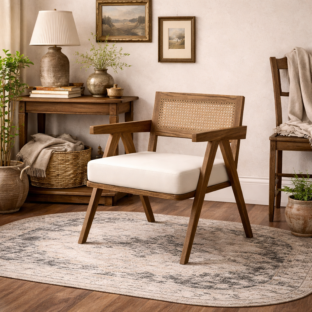 Martone Wooden Rattan Ecru White Woven Accent Chair