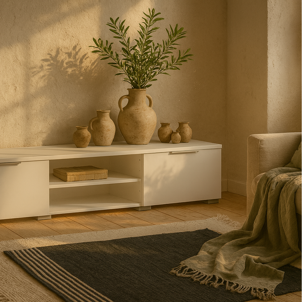 Clean lines set the tone with this TV unit, finished in crisp white gloss that brightens the room and keeps the look feeling modern and uncluttered. Open shelving gives space to style media pieces or favourite objects, while the overall design keeps everything looking calm and considered rather than busy.