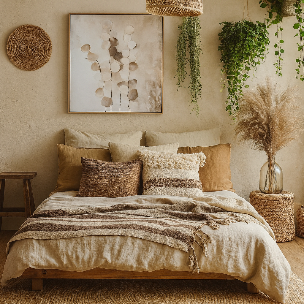 This artwork embraces a raw, organic spirit with its textured canvas and earthy palette of taupe, cream, and soft stone hues. The abstracted botanical forms evoke delicate stems and rounded leaves, painted with bold, almost sculptural strokes that catch the light and create quiet depth. It feels both modern and timeless, echoing the imperfect beauty of nature through restrained, minimal expression.