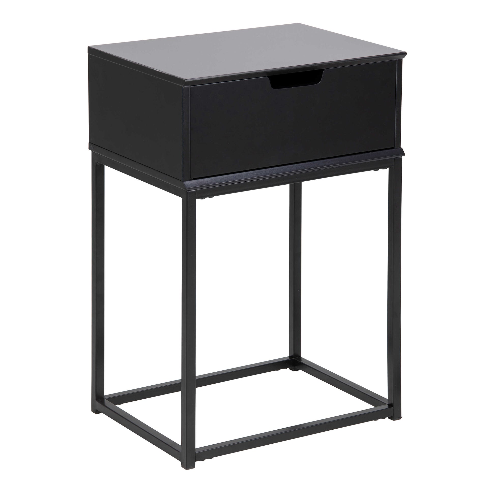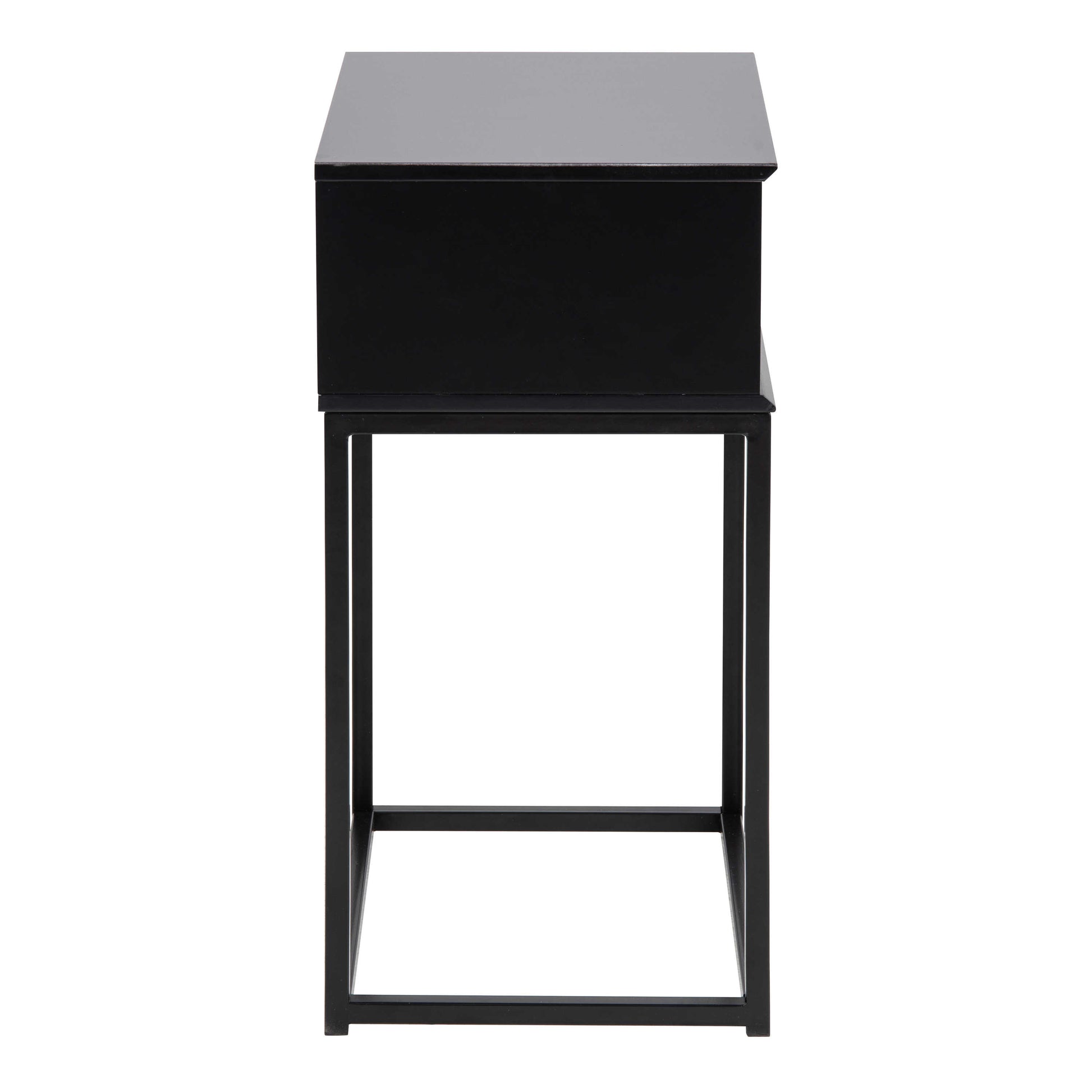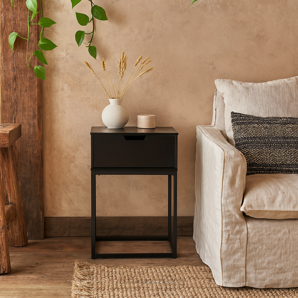 Bring a cool contemporary edge to your bedroom with this bedside table that pairs a black MDF top and drawer with a matt black steel base. The clean lines give it a calm modern feel while the integrated handle adds a subtle crafted detail. It settles neatly beside the bed, offering a relaxed place to keep a book, glasses or a late night drink within easy reach.