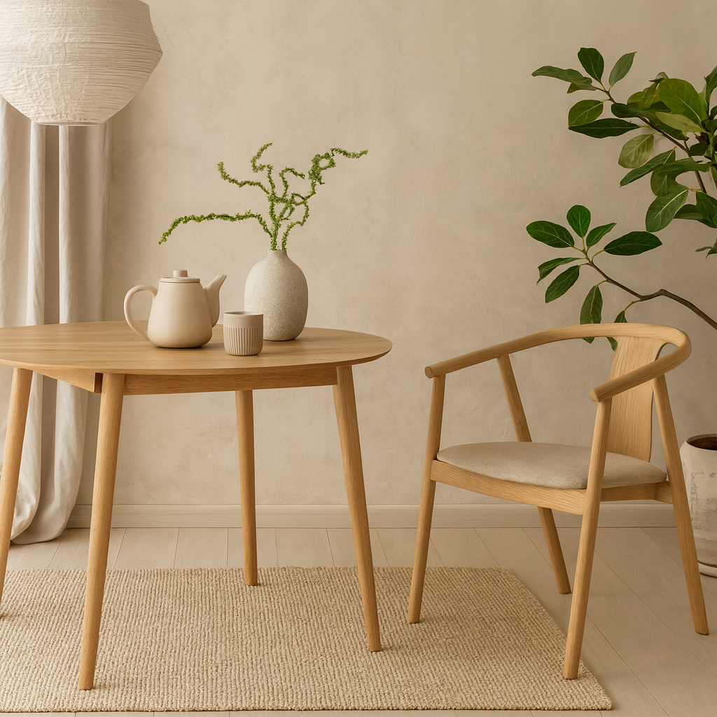 This dining table brings a warm natural mood with its smooth oak veneer top and compact round form, creating a relaxed hipster charm that suits bright kitchens, cosy flats, or calm contemporary homes. The soft grain adds gentle character while the balanced silhouette keeps the room feeling open and inviting. Its compact footprint makes it easy to place, yet it comfortably seats four to five people for relaxed family meals or friendly gatherings.