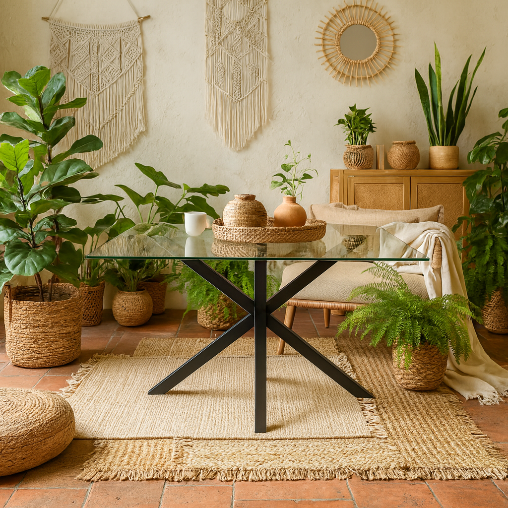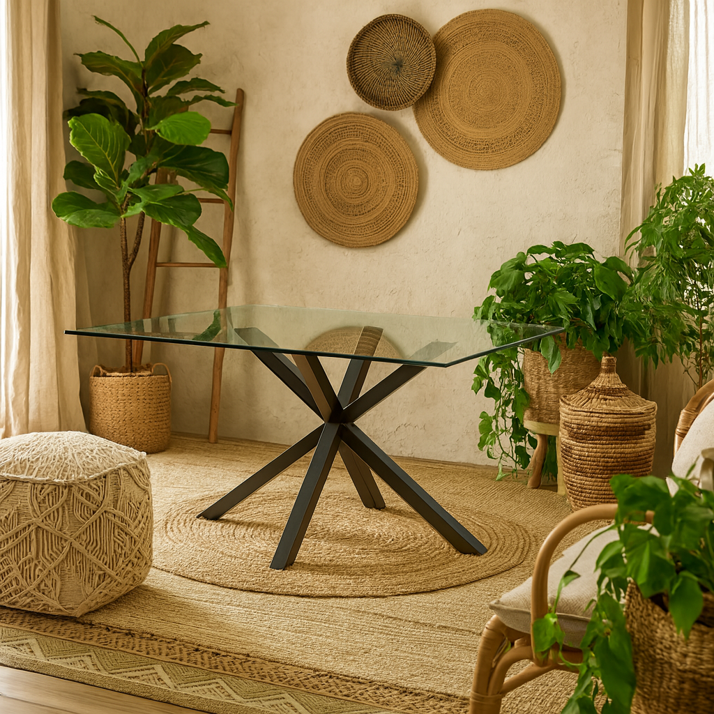 This dining table strikes a sleek balance between modern minimalism and industrial edge. The clear glass top keeps the look light and airy, while allowing the bold cross-leg base in matte black metal to become a sculptural feature in its own right.