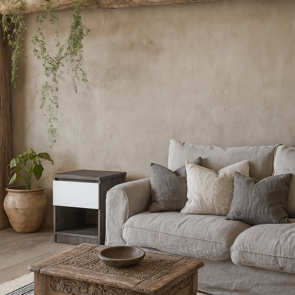 This bedside table brings a cool urban mood with its concrete inspired finish paired with bright white gloss, creating a relaxed hipster edge that suits modern bedrooms. The compact form keeps the space feeling open, while the bold contrast adds quiet character to rooms with soft tones or minimalist decor. Its simple structure blends easily into contemporary interiors and offers a small touch of expressive style.