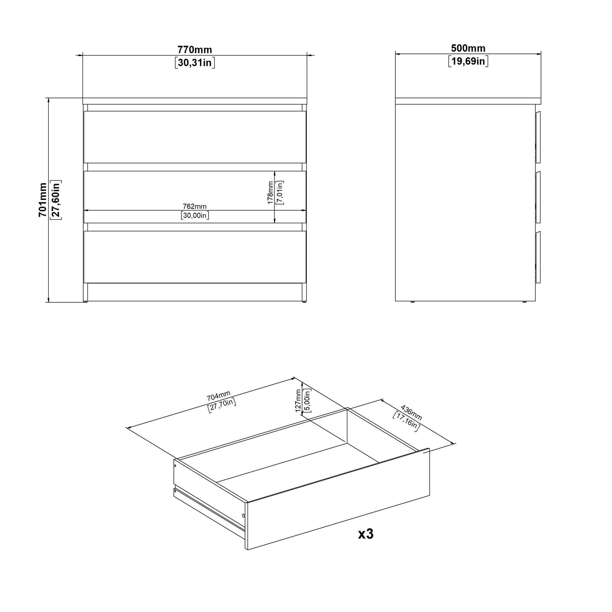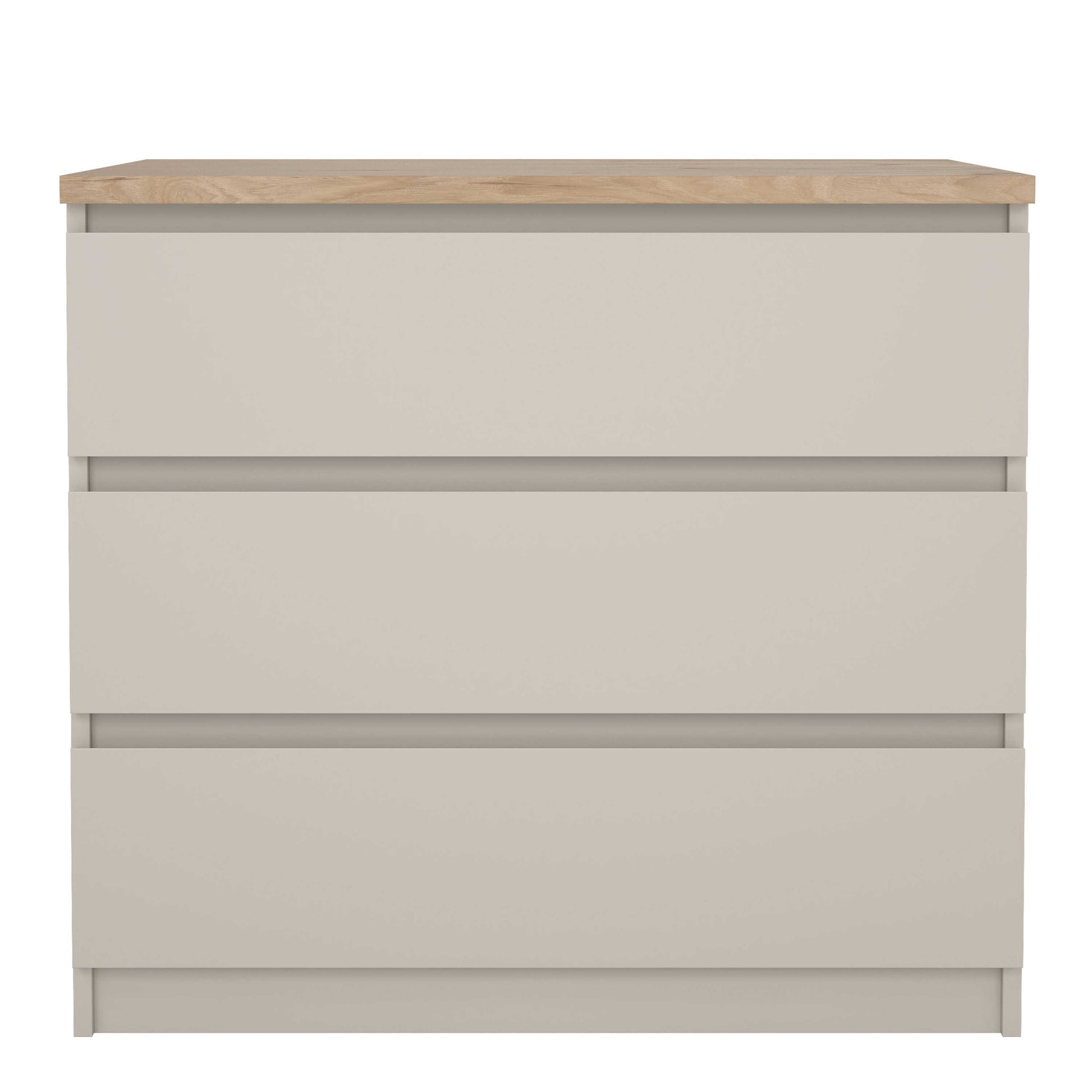 This chest brings a soft cashmere tone paired with a warm oak style top, creating a calm and contemporary mood with laid back hipster charm. Designed at a comfortable bedside height, its three spacious drawers glide smoothly on sturdy mechanisms, keeping clothing, books, and evening essentials neatly organised. The natural grain on top adds gentle warmth and offers a perfect place for candles, plants, or small decorative pieces.