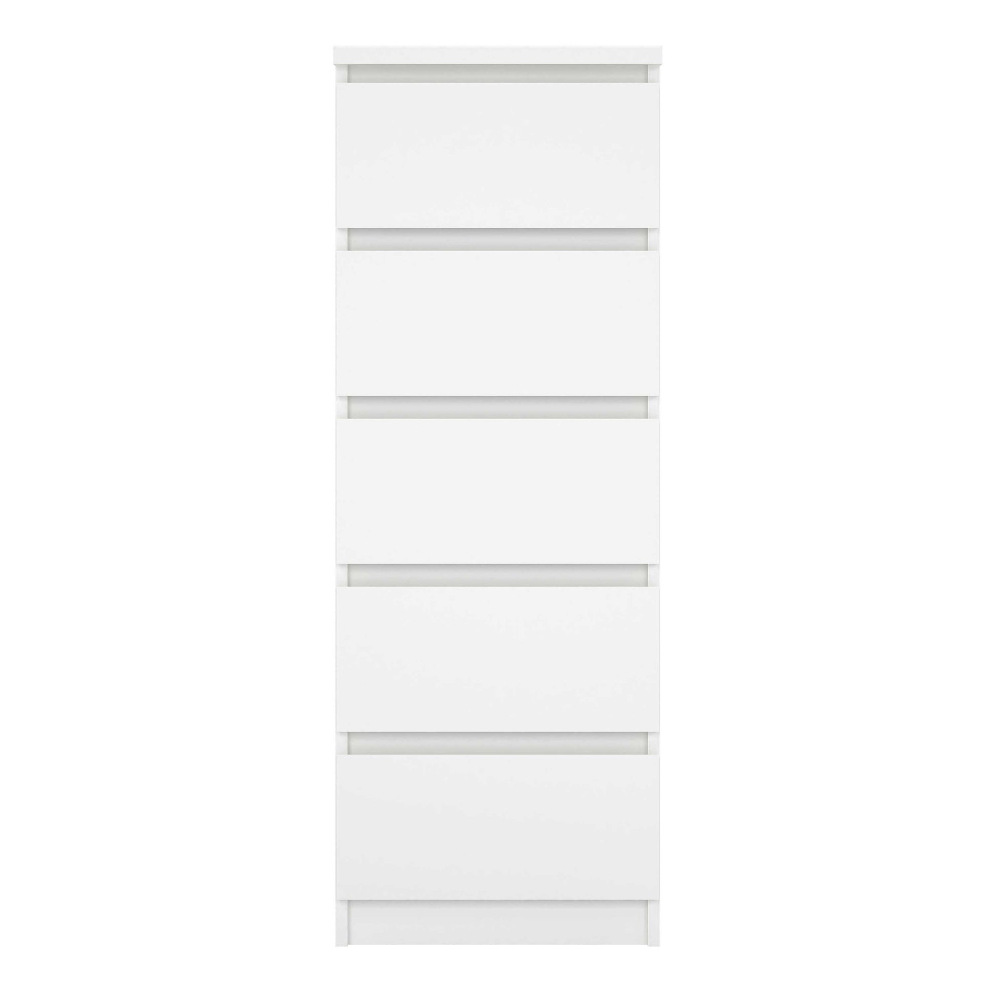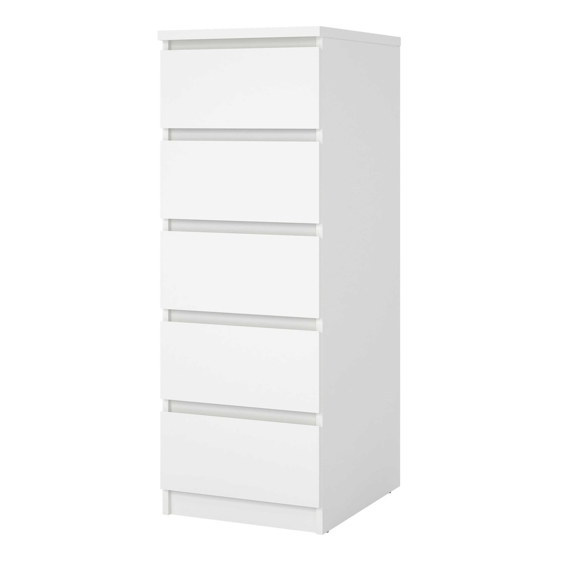 Five drawers glide smoothly on sturdy runners, offering tidy space for clothing and daily essentials. Made from durable laminated board, it stands up well to everyday use while maintaining a calm refined look. This compact piece provides practical organisation with a relaxed modern charm.