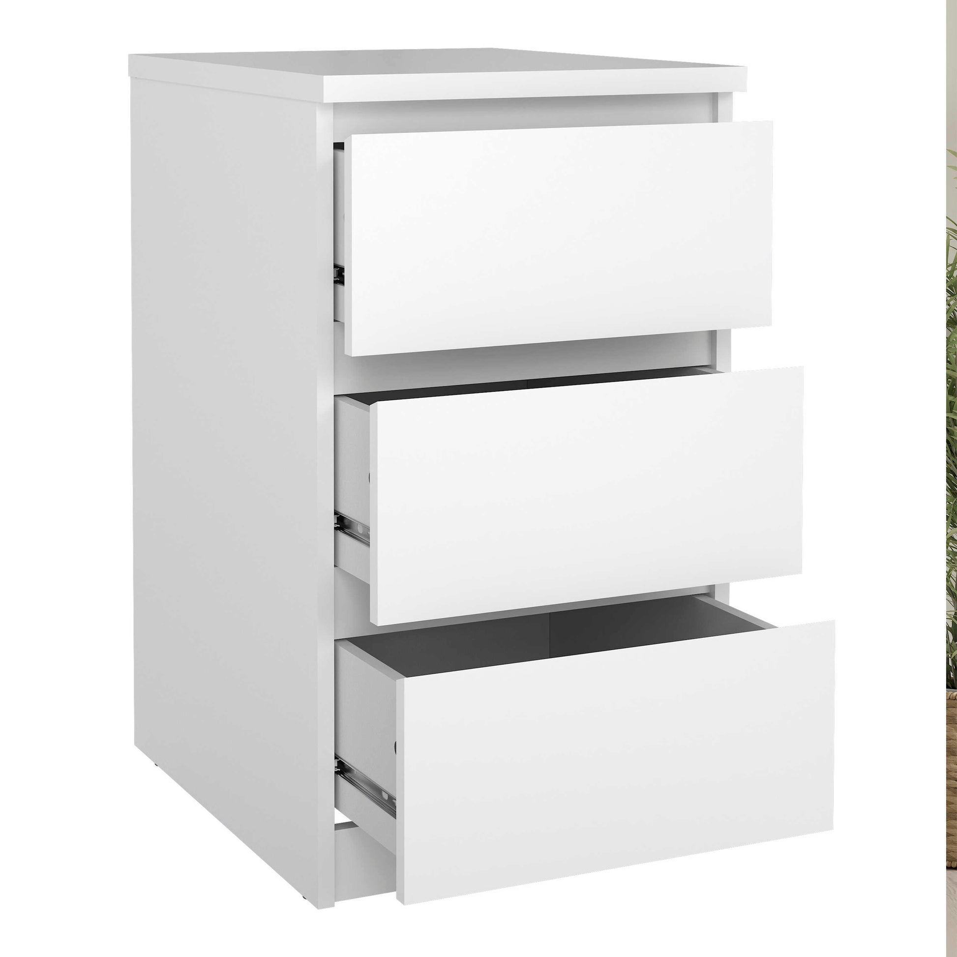 This three piece set brings a bright contemporary mood with its smooth white gloss finish and calm minimalist lines, creating an easy hipster charm that transforms the room with a collected modern feel. The matching bedside table, tall chest, and spacious wardrobe work together to keep the space open and organised, offering a refreshing sense of balance. Each piece is crafted from durable materials that stand up well to daily life while maintaining a polished look.