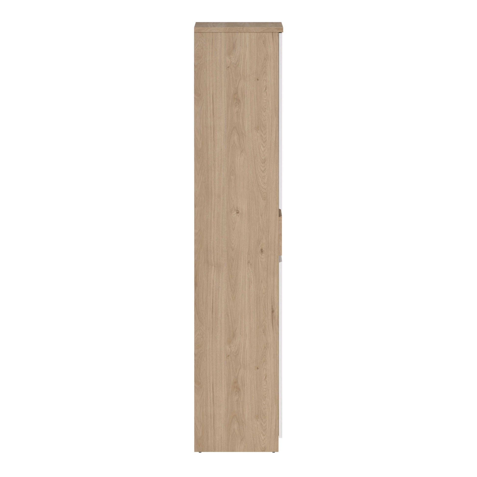 This shoe cabinet brings a tall elegant presence with its warm oak style finish paired with crisp white fronts, creating a calm modern look with relaxed hipster charm. The clean lines and balanced tones make it a natural addition to hallways or bedrooms, offering a tidy way to manage growing shoe collections and everyday accessories. Its simple silhouette settles easily into soft neutral spaces or contemporary interiors with light flooring.