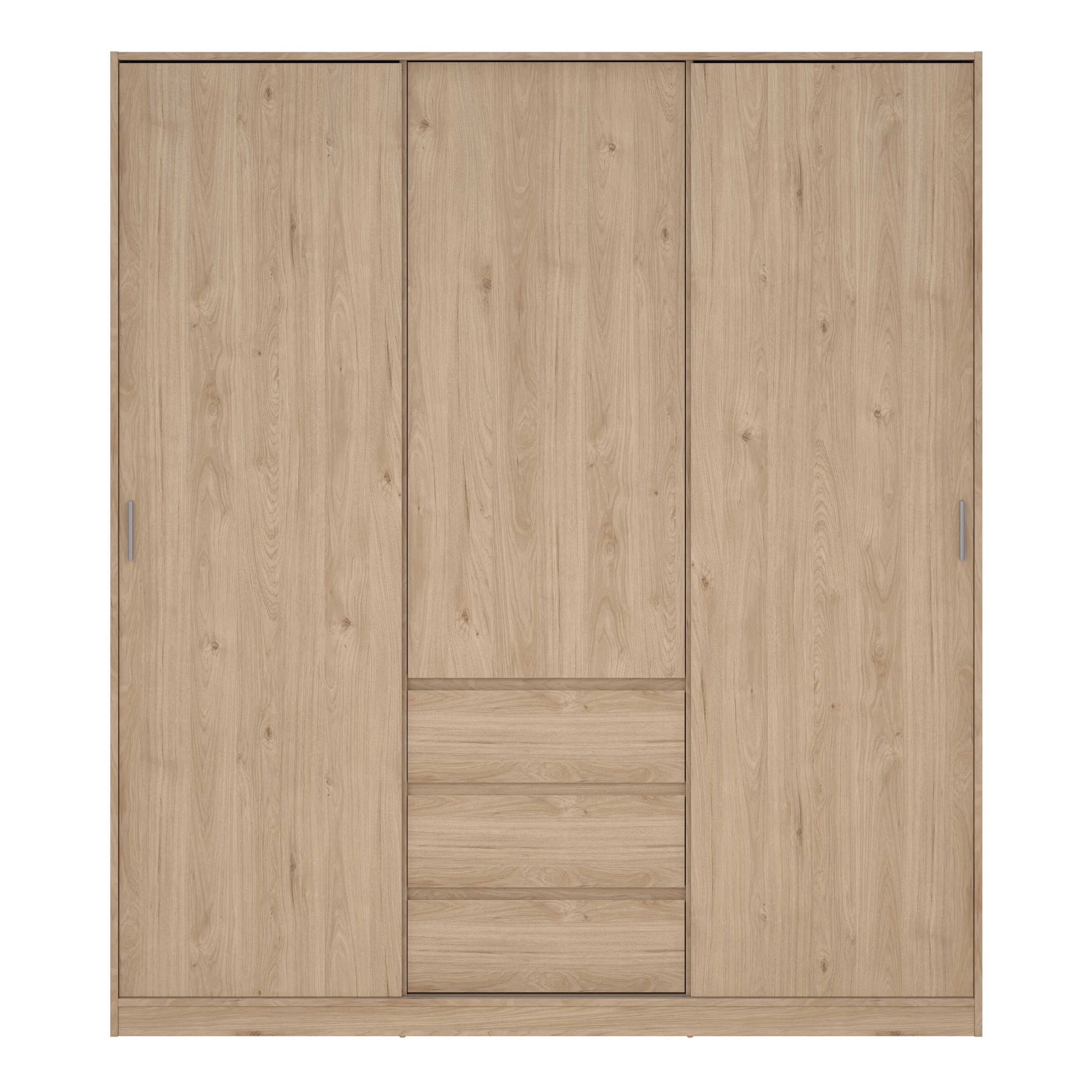 This wardrobe brings a warm modern mood with its rich oak style finish, creating a relaxed hipster charm that feels right at home in contemporary bedrooms. The natural grain adds depth and character, while the clean structure keeps the room feeling open and collected. Two sliding doors save valuable floor space and a third door opens to reveal extra room for folded pieces. Three smooth drawers offer tidy storage for smaller essentials, and the generous hanging area keeps outfits ready to go.