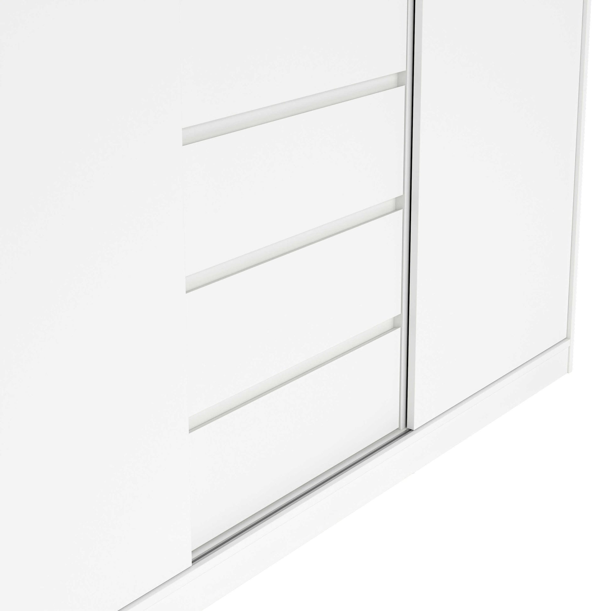 This wardrobe brings a calm contemporary mood with its simple structure and generous mix of storage options suited to modern living. Two sliding doors and a hinged door open to reveal rails for hanging clothes, adjustable shelves for flexible organisation, and fixed shelves for items that deserve a steady place. Three easy glide drawers keep smaller pieces neatly arranged, creating a relaxed hipster feel that blends effortlessly into a modern bedroom.