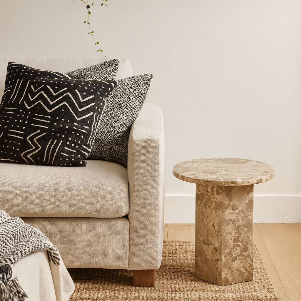 Its compact form makes it an easy addition beside a sofa or lounge chair, offering a grounded spot for books, candles, or curated objects. The natural stone effect brings subtle depth and texture, creating a functional accent that feels both expressive and timeless.