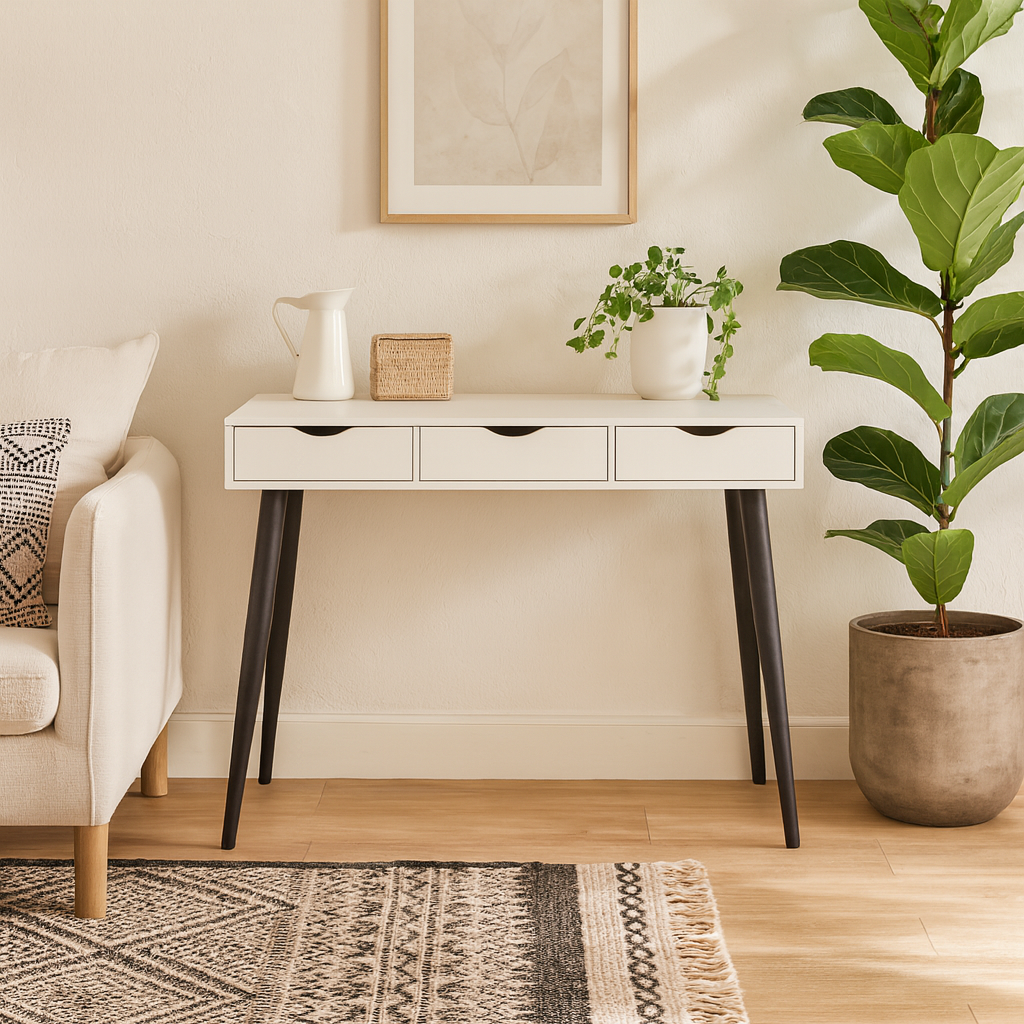 Three drawers glide smoothly on metal runners, providing easy storage for stationery and everyday essentials. The surface is simple to maintain, making it a smart choice for busy routines. This desk blends function with effortless style to support a balanced and organised workspace.