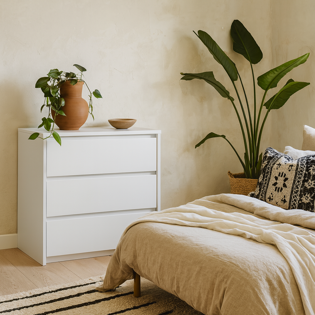 Three roomy drawers offer practical storage for clothing, stationery, and everyday clutter, keeping your space feeling clear and curated. The drawers open with an easy glide that suits a laid back routine. Add a lamp, a small stack of books, or a favourite photo to give it your own style.