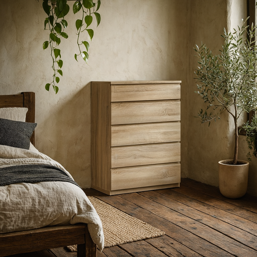 This chest brings a calm modern feel to any room, blending a clean oak effect finish with a streamlined handleless design for a minimalist look. The gently wrapped edges add a soft, contemporary touch, while the durable laminated surface keeps the piece looking fresh through everyday use. Its understated silhouette makes it easy to pair with a wide range of interior styles, from Scandinavian inspired spaces to warm, natural bedrooms.