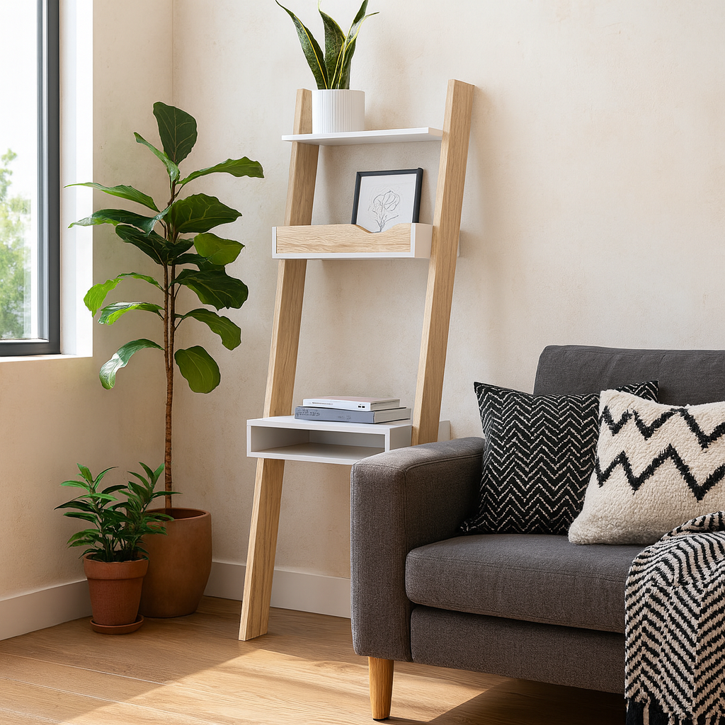This leaning desk brings a bright Scandinavian touch to compact workspaces, using a ladder style frame to maximise vertical space while keeping the room feeling open and uncluttered. The white and oak colourway adds a soft, modern warmth, blending easily with minimalist interiors or calm study corners. Made from high quality laminated board, it resists everyday wear while maintaining a clean, contemporary look.