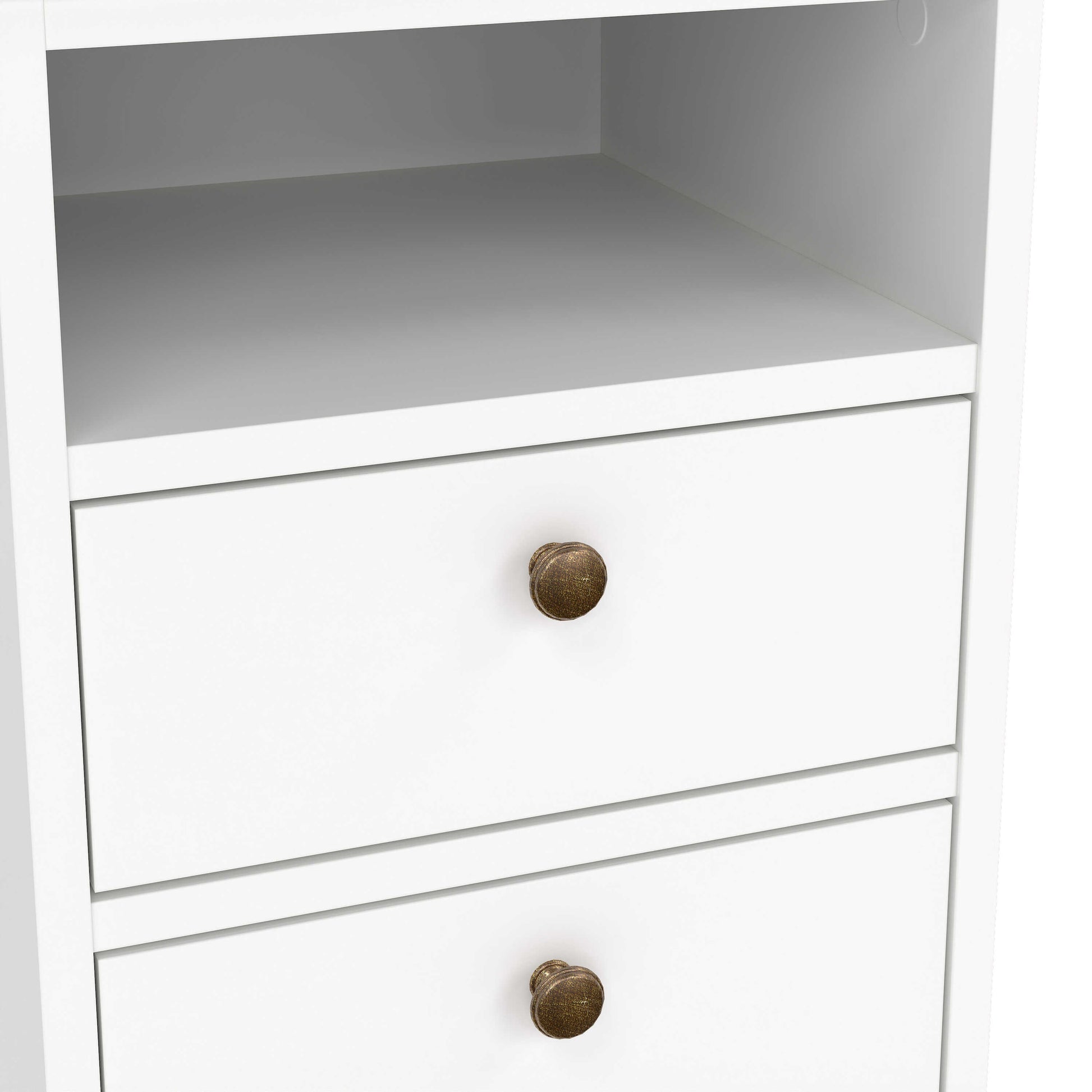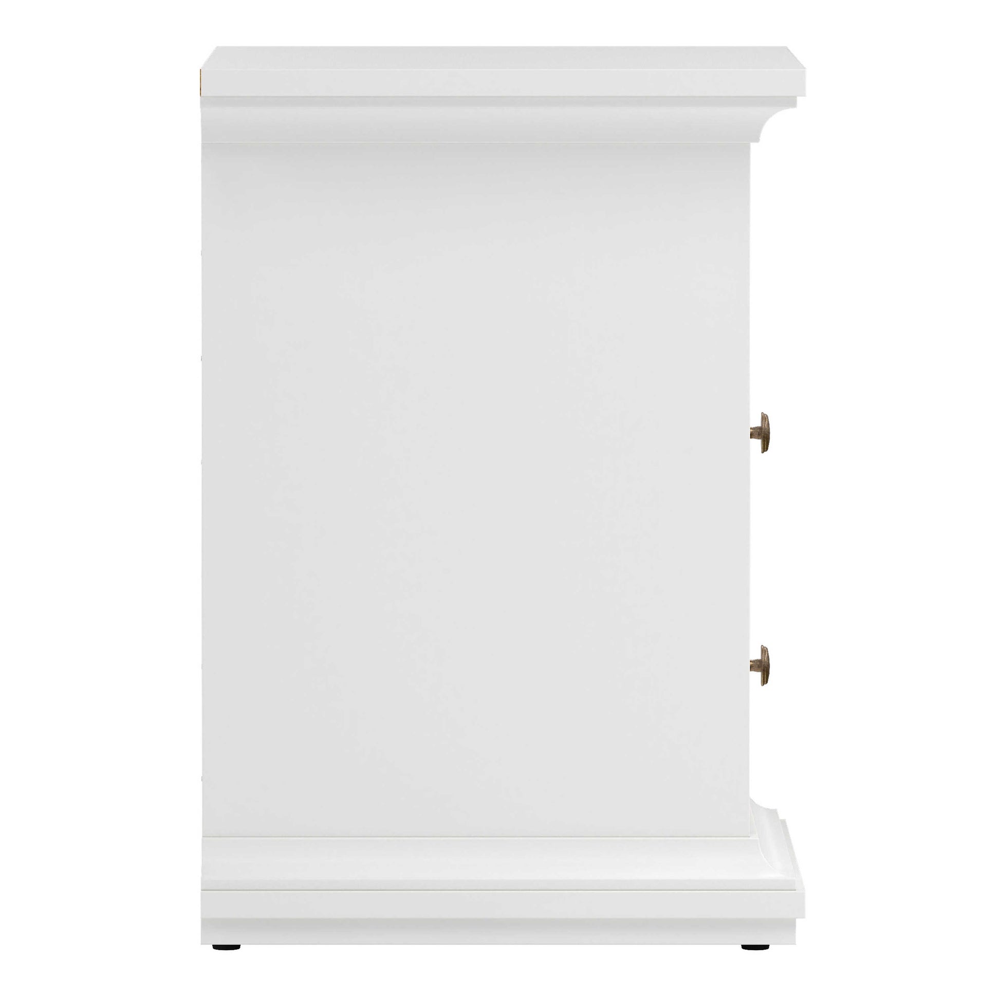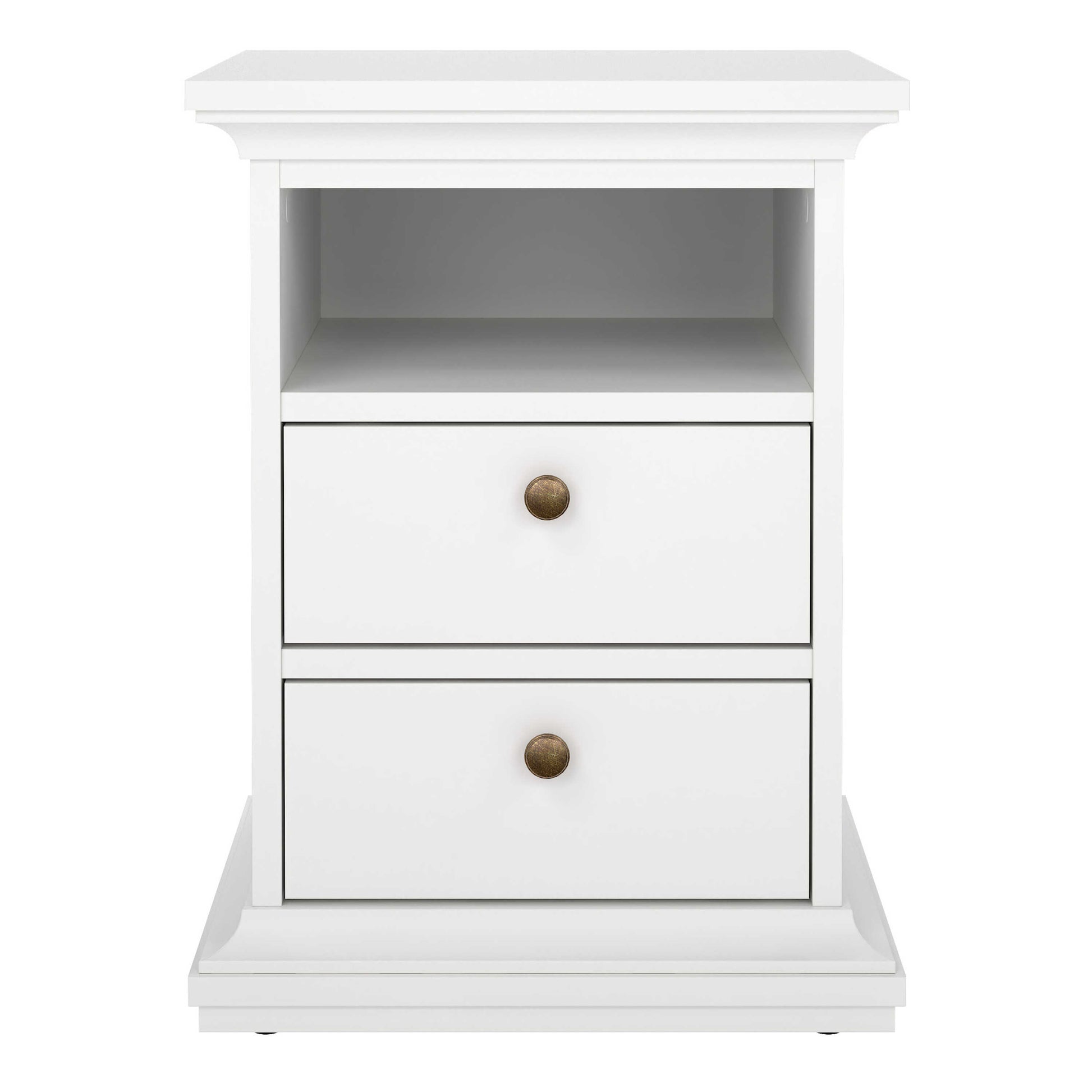 This bedside table brings a fresh timeless charm with its crisp white finish and classic framed design. The gentle moulding along the top and base lends a traditional character, while the smooth painted surface keeps the look bright and modern. An open shelf sits above two neatly proportioned drawers, offering a mix of display space and practical storage. Warm brass toned knobs provide a soft vintage accent that contrasts beautifully with the light colour.