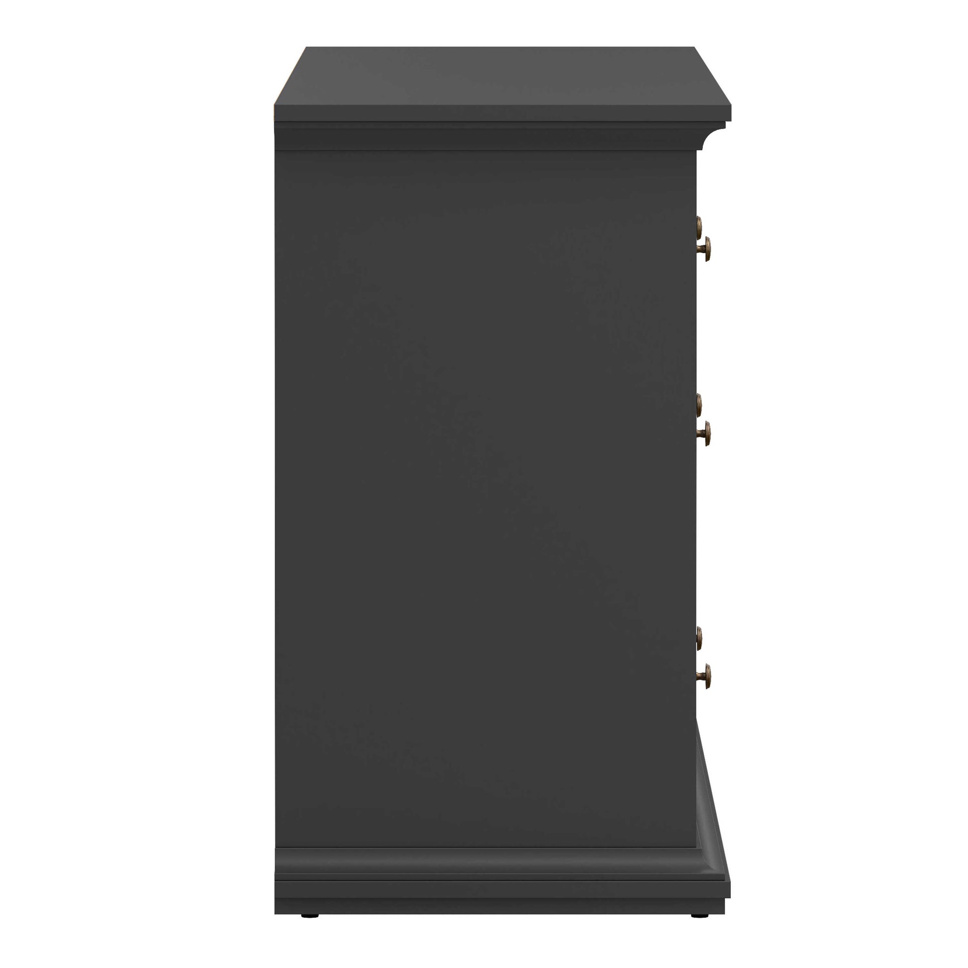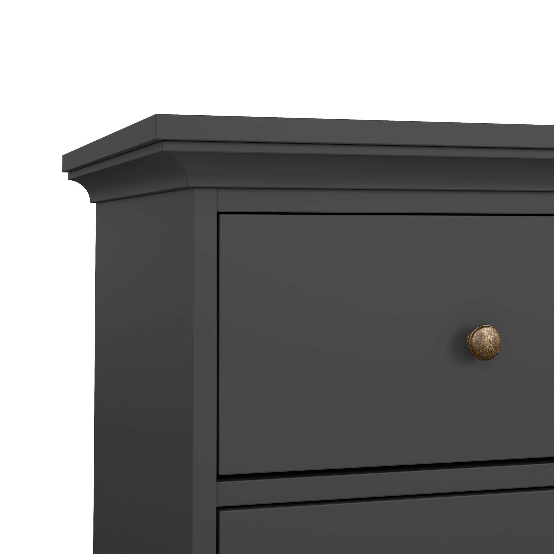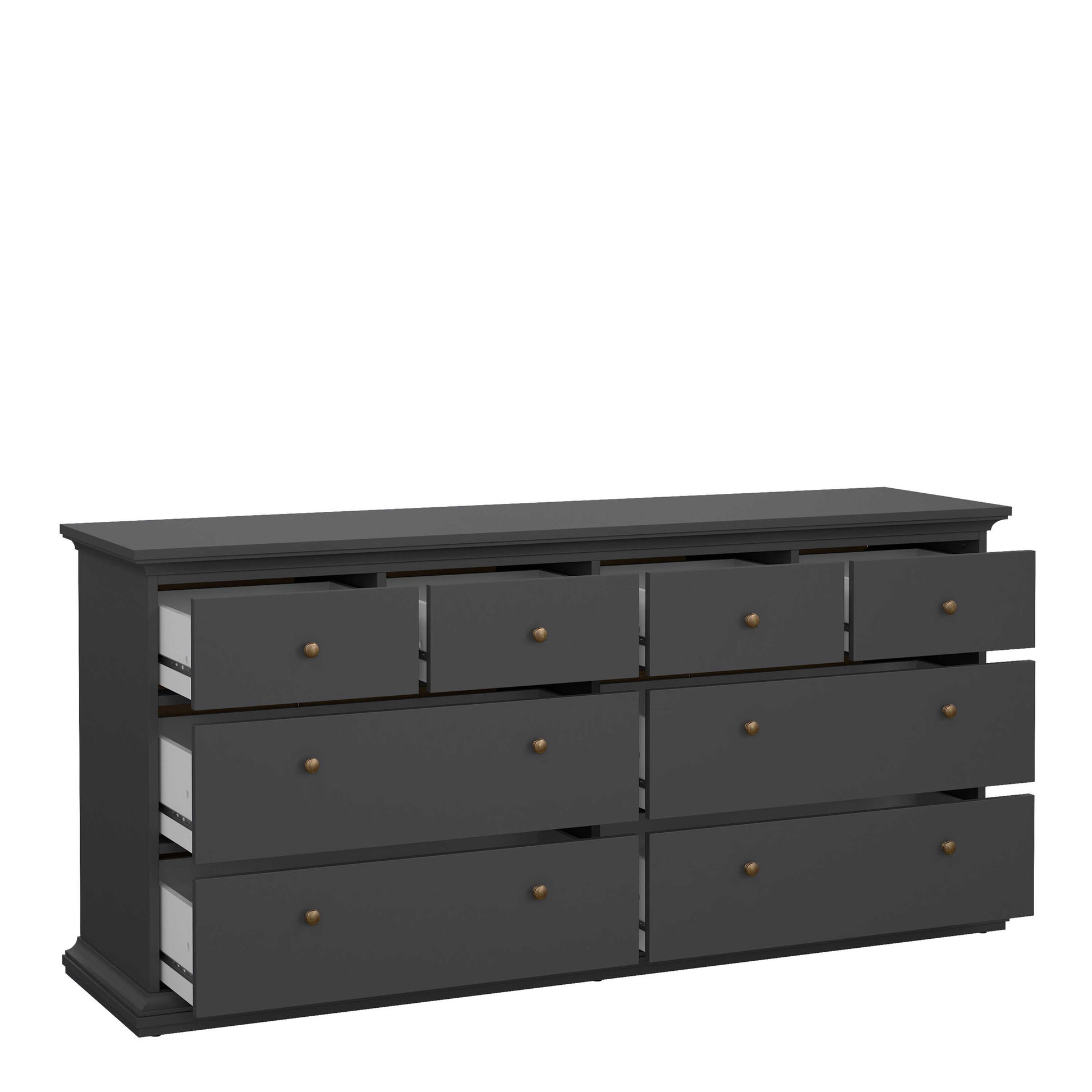 This wide chest of drawers brings a bold modern presence with its deep charcoal finish and refined framed silhouette. The dark tone grounds the design, giving it a contemporary edge, while gentle moulding along the top and base adds a touch of classic character. Warm brass toned knobs soften the overall look and introduce a subtle vintage accent that contrasts beautifully with the darker surface. The arrangement of small upper drawers and spacious lower drawers creates a balanced and harmonious layout.