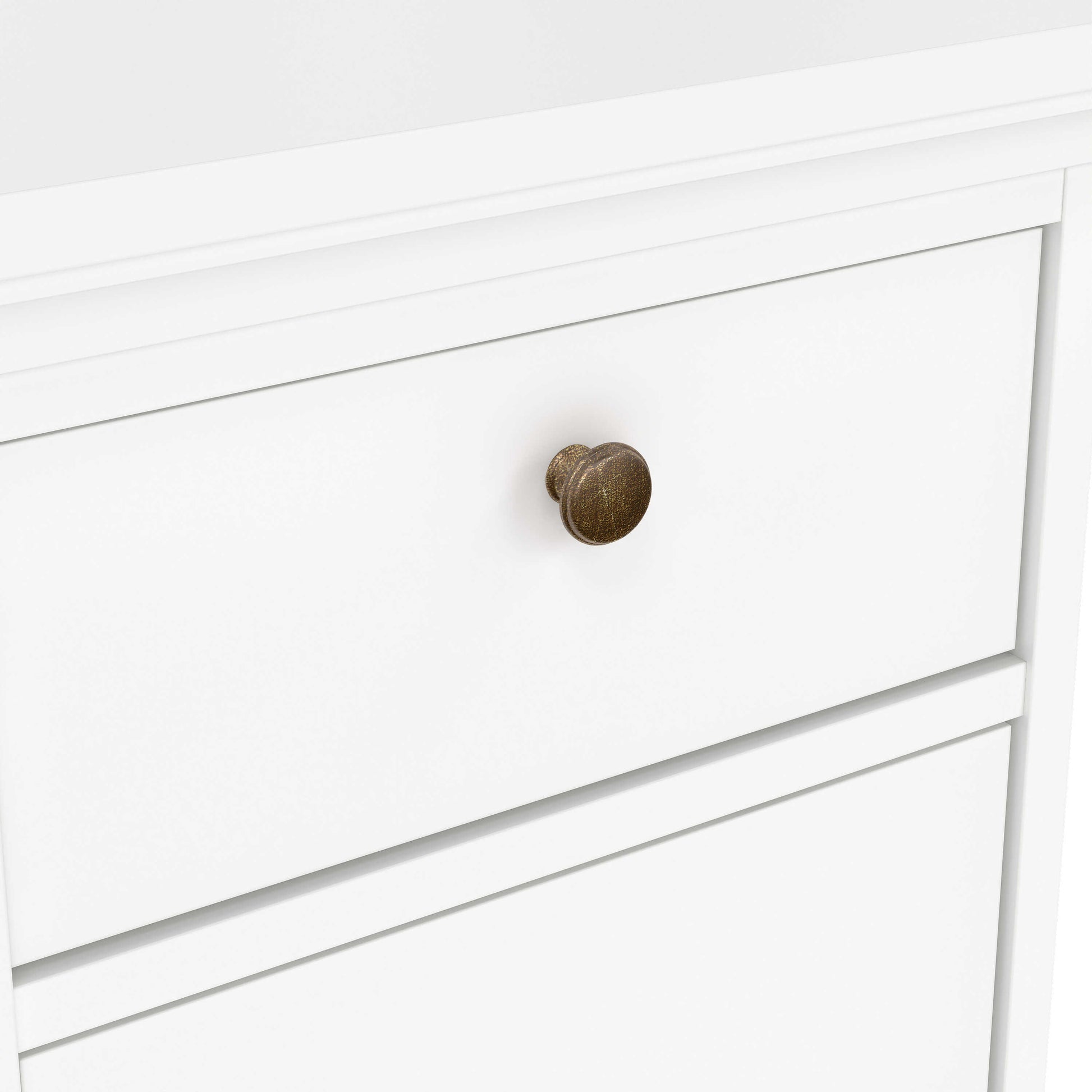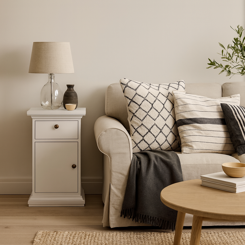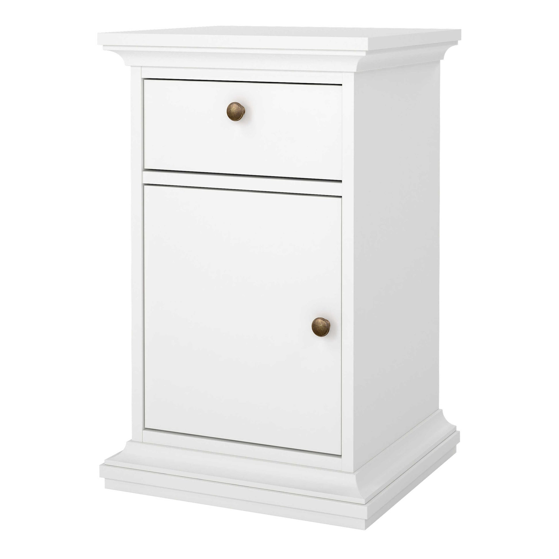 This bedside cabinet brings a calm classic charm with its crisp white finish and refined framed design. The gentle moulding along the top and base gives it a traditional character, while the smooth painted surface keeps the overall look fresh and modern. The warm brass toned knobs add a subtle vintage accent that softens the bright colour and enhances the timeless feel. A single drawer sits above a spacious cupboard, offering simple organised storage.