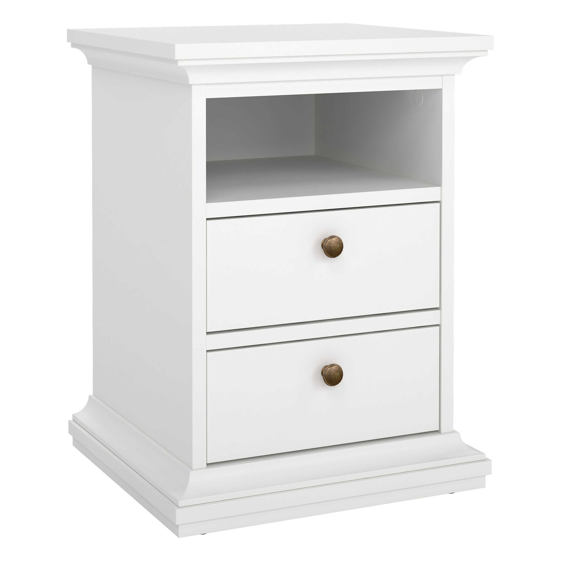 This coordinated bedroom set brings a fresh timeless presence with its crisp white finish and clean framed design. The painted surfaces create an airy uplifting feel, while subtle moulding gives each piece a gentle traditional touch. Warm brass toned knobs add a soft vintage accent that contrasts beautifully with the bright colour. The arrangement includes a tall wardrobe, a spacious chest of drawers, and a compact bedside unit, all shaped with balanced proportions that enhance a calm modern interior.