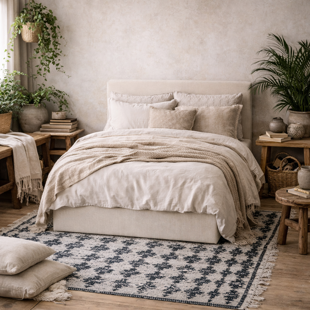 Finished in soft ivory twill fabric, this double bed brings a relaxed industrial mood with a gentle, inviting edge. The upholstered frame adds warmth and texture, balancing clean structure with a lived in feel. Its proportions feel considered and grounded, making it a natural focal point without overwhelming the room.