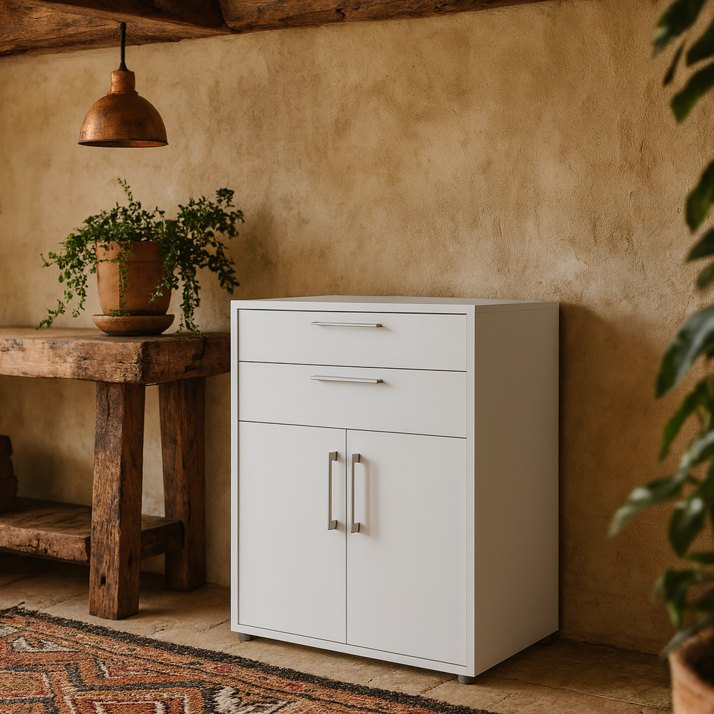 This white bookcase brings a bright organic calm to a room with its clean finish and softly crafted character. The open shelf creates an inviting place for books or decorative pieces, while the drawers and doors below keep everyday items neatly organised. Its compact shape suits interiors that value relaxed order, natural light and a gentle modern mood.