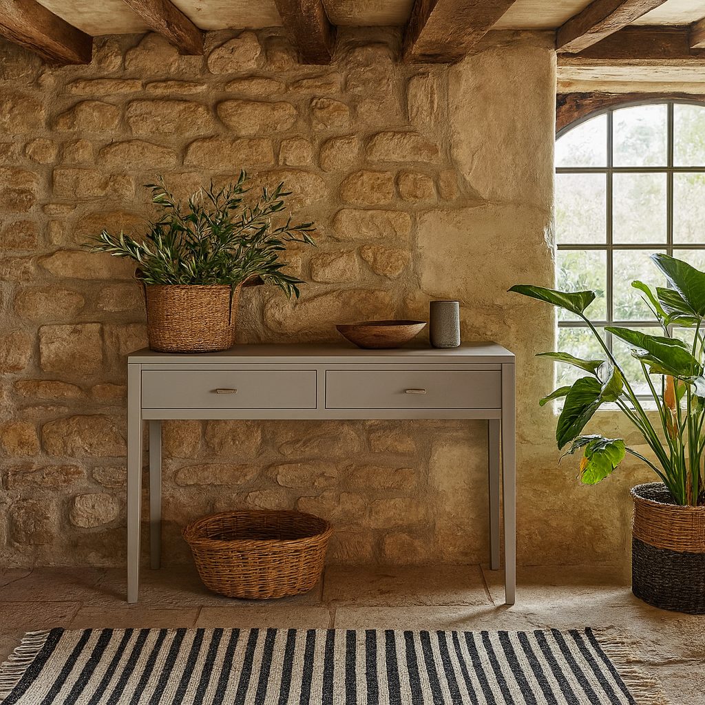 With two drawers for essentials, it combines practicality with understated style. Pair it with a linen chair, soft lighting, and natural accents for a calm, inspiring setting — a perfect example of simplicity done beautifully.