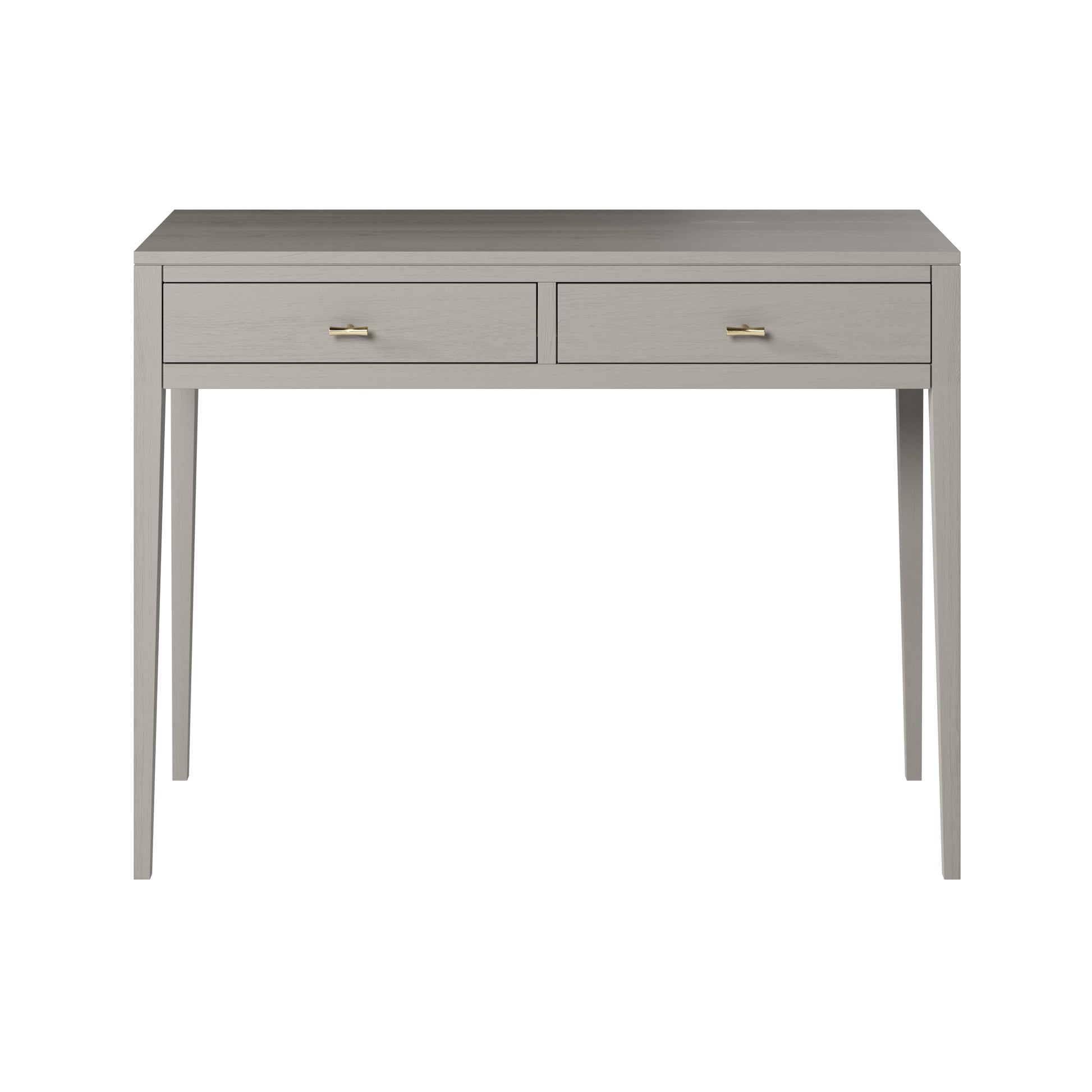Clean, refined, and quietly sophisticated, this piece brings modern serenity to the workspace or dressing area. The mist grey wood grain finish softens its structured lines, while the brass handles add a warm, contemporary touch. Its slender legs and smooth edges create a graceful, balanced silhouette that feels both timeless and fresh.