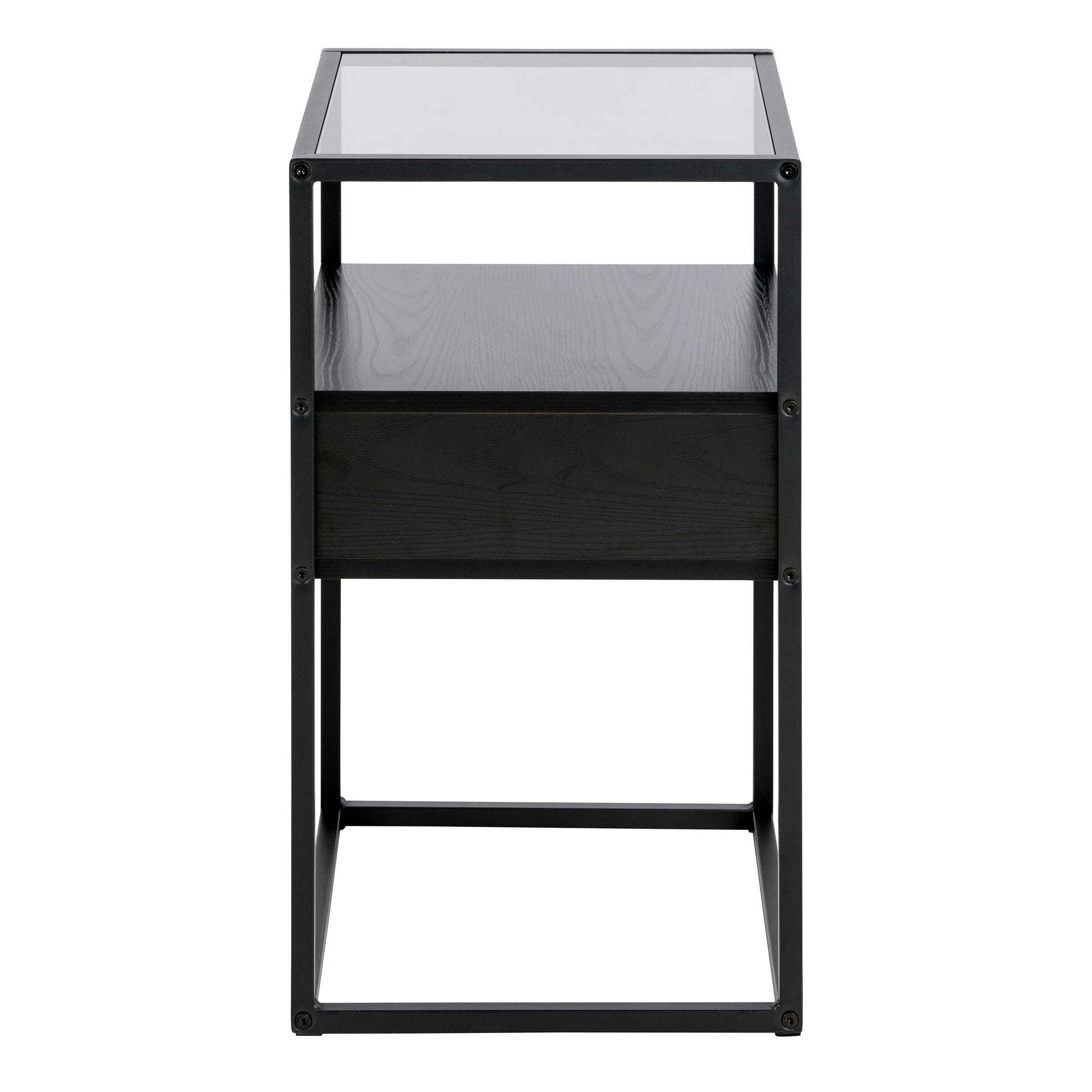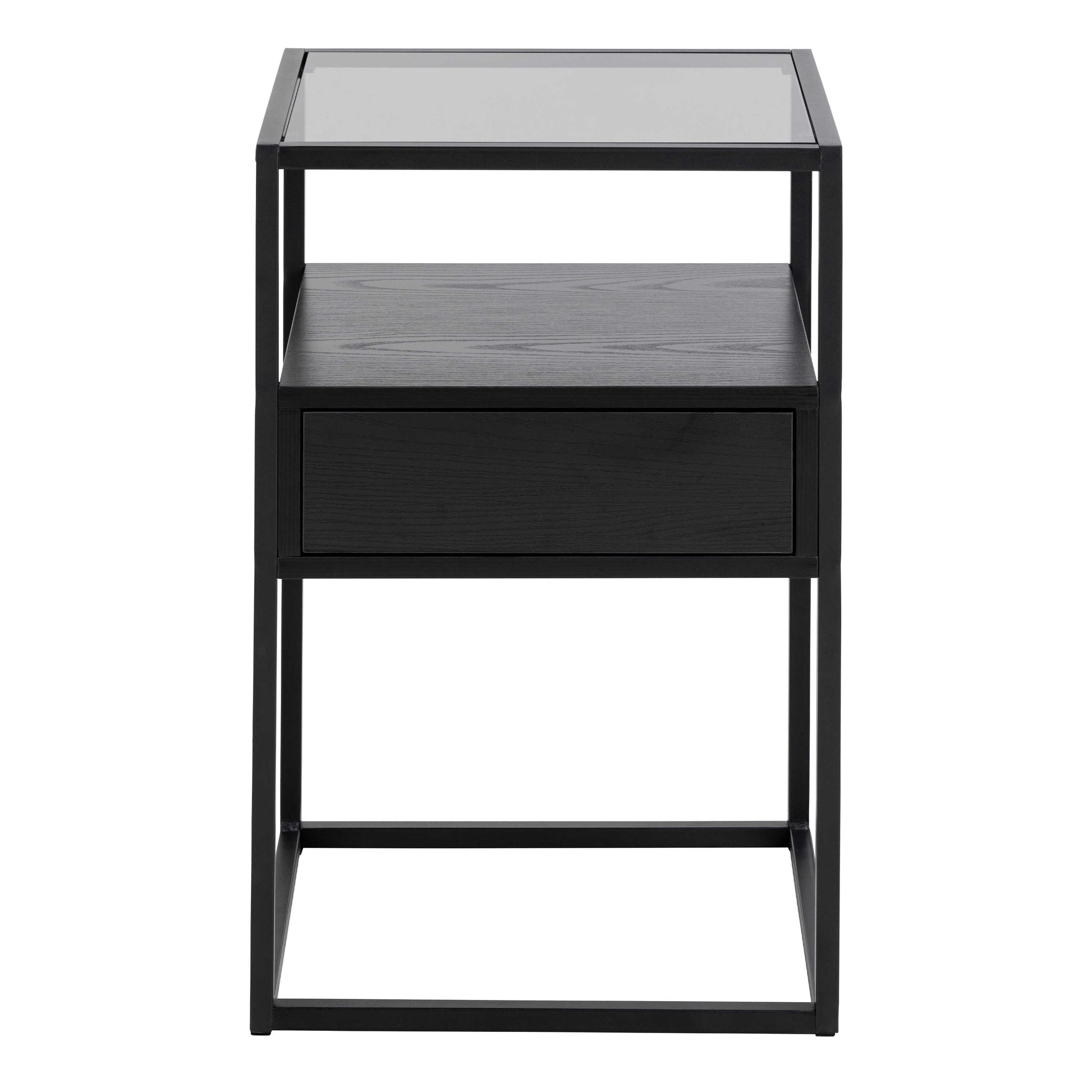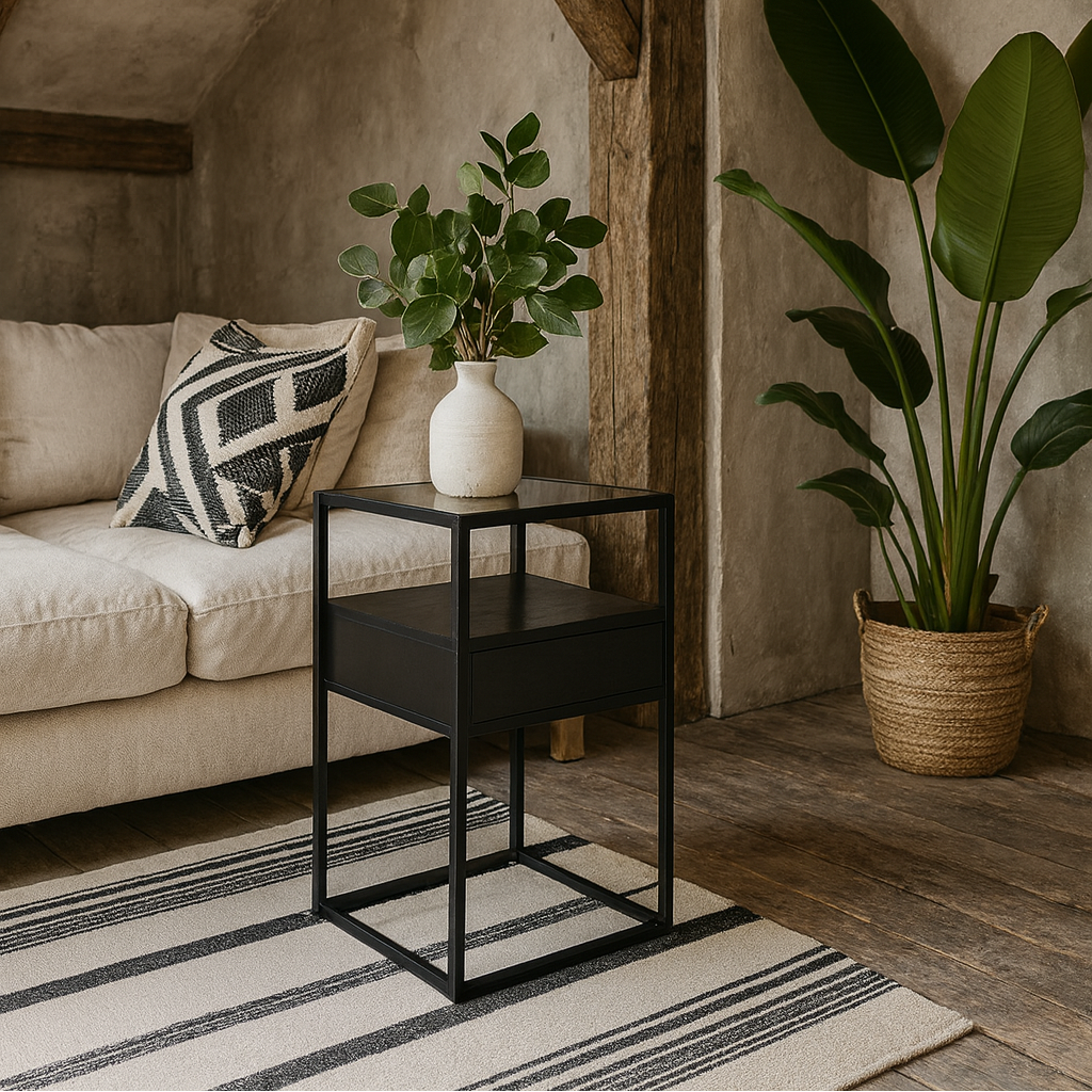 This bedside table brings a sleek contemporary edge to any bedroom, pairing a smoked tempered glass top with a smooth black finish for a refined, minimalist look. The clean lines and dark tones create a sophisticated presence beside the bed, while the powder coated steel frame adds stability and an industrial touch. Its compact form suits modern, urban and Scandinavian inspired interiors.