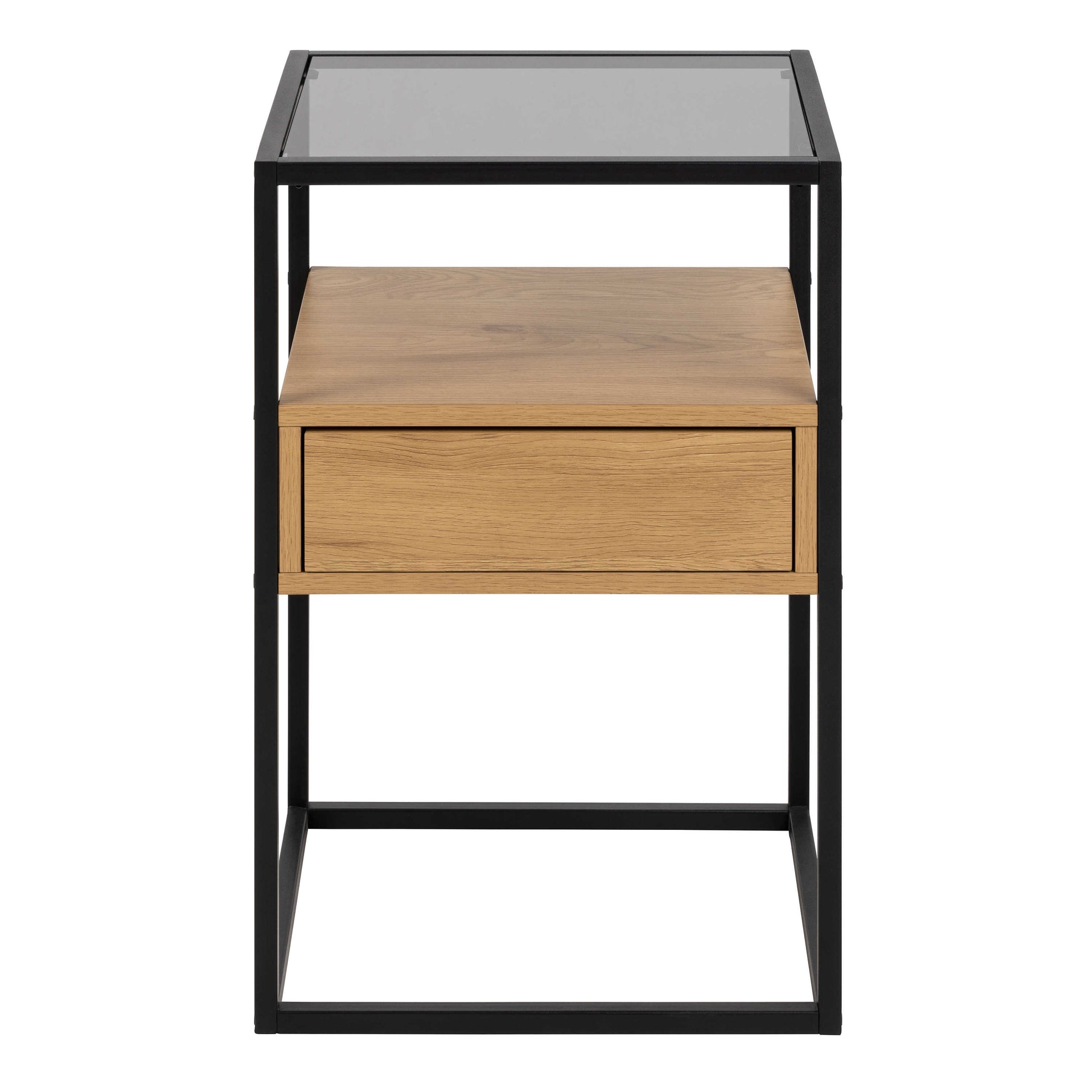 Wrenna Black and Natural Oak Effect Square Bedside Table 1 Drawer Glass Top