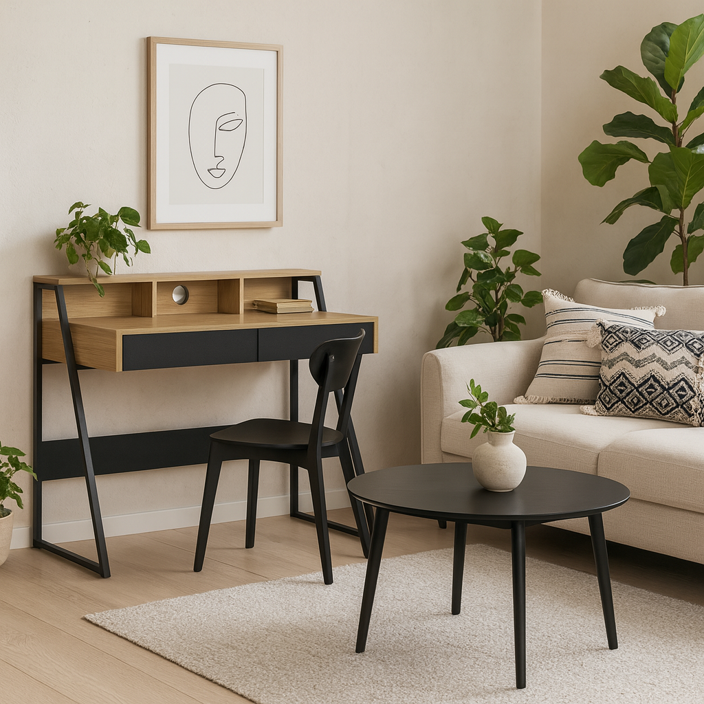 This desk brings a clean industrial edge to any workspace, pairing a wild oak melamine top with a sleek black powder coated steel base for a balanced, contemporary look. The natural wood effect adds warmth and texture, while the minimalist frame keeps the design open and refined. Compact yet functional, it fits seamlessly into home offices, bedrooms or creative corners.