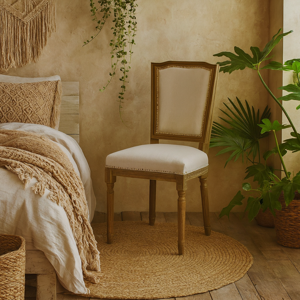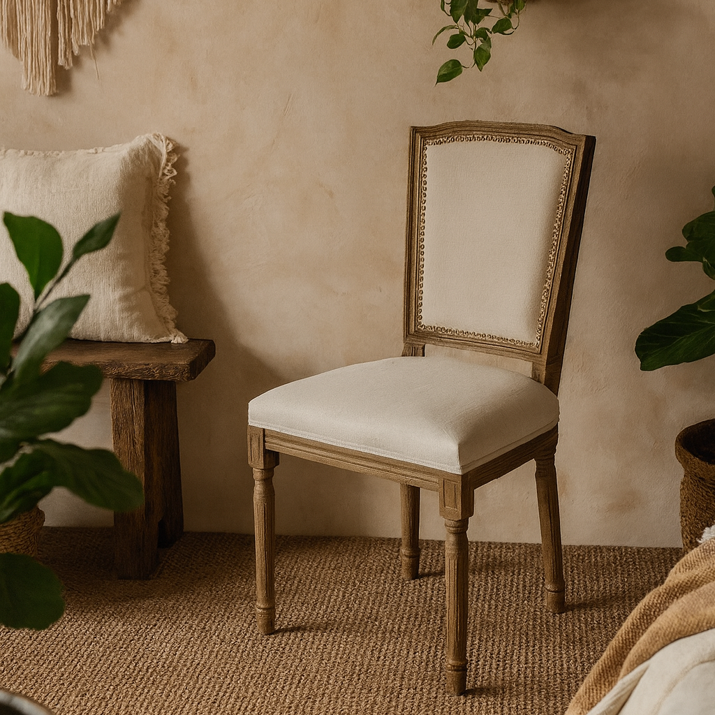 This chair brings a refined, old-world charm with just the right touch of modern edge. The carved wooden frame, finished in a warm earthy tone, sets the stage for the soft upholstered seat and backrest. Clean linen fabric edged with nailhead trim gives it that subtle detail that feels classic yet current, making it versatile enough to work around a rustic farmhouse table or in a chic Parisian-inspired dining room.