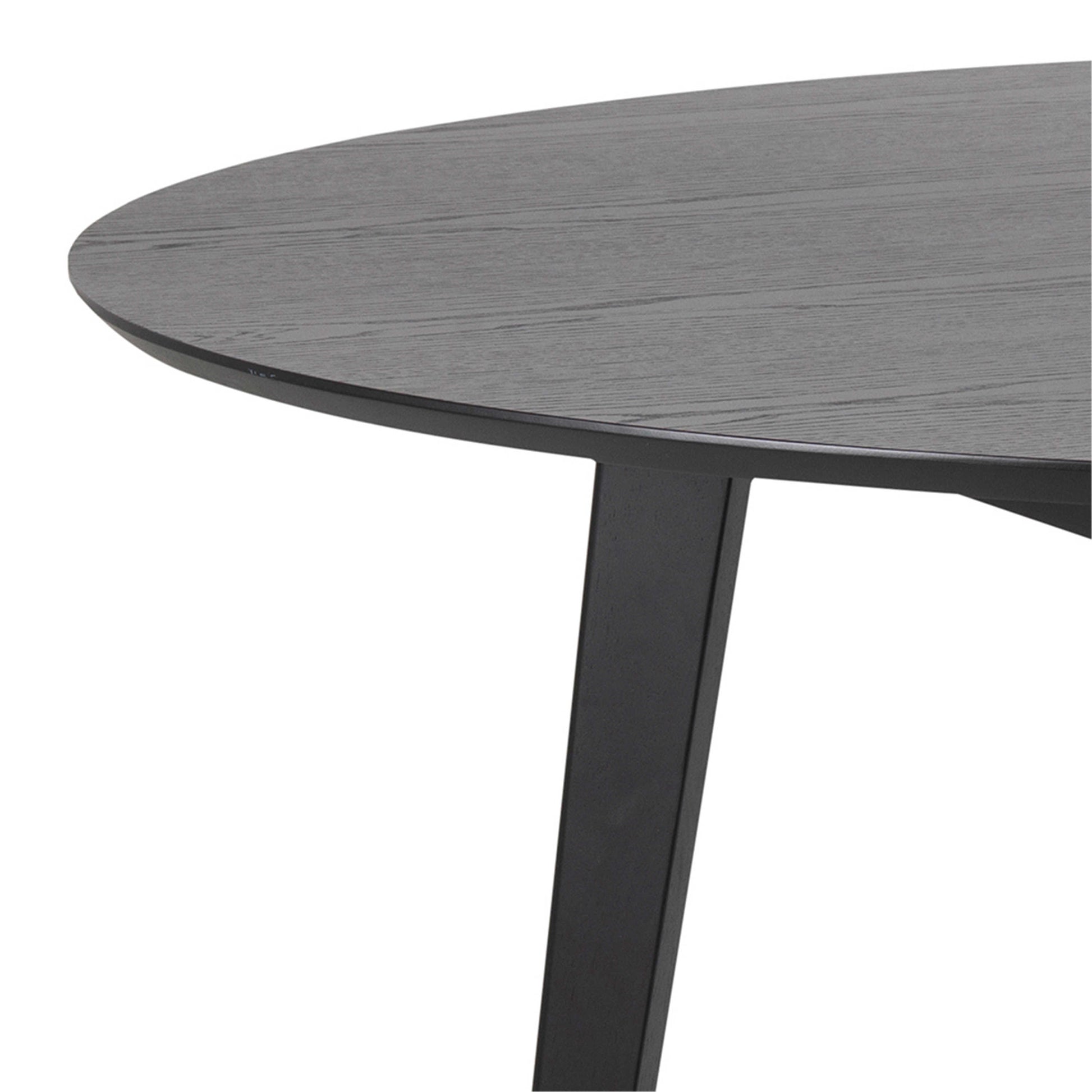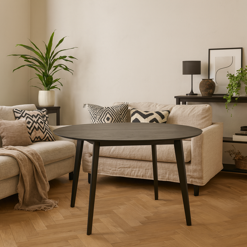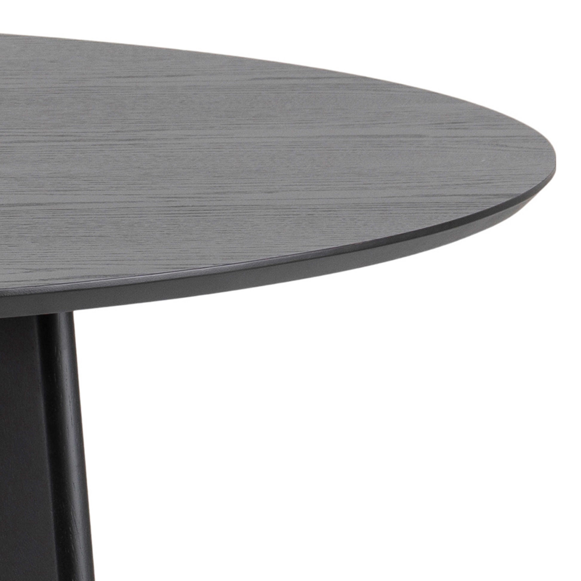 This round dining table brings bold contemporary elegance to any dining room, pairing a black stained oak veneer top with a sturdy matte black base for a refined, sculptural look. The softened edges and smooth finish create a sophisticated focal point, while the expansive surface offers plenty of room for hosting, family meals or relaxed everyday dining. Its rich tone adds depth and drama, making it an effortless match for modern, minimalist or monochrome interiors.