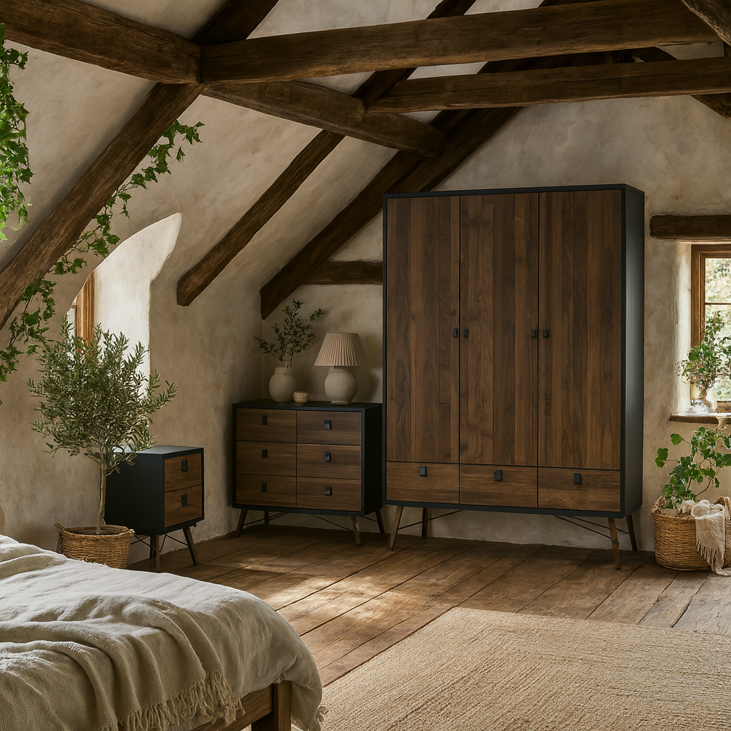 Juno Black and Walnut Wood Furniture Set - Wardrobe 3 Doors and 3 Drawers + Chest 6 Drawers + Bedside Table 2 Drawers