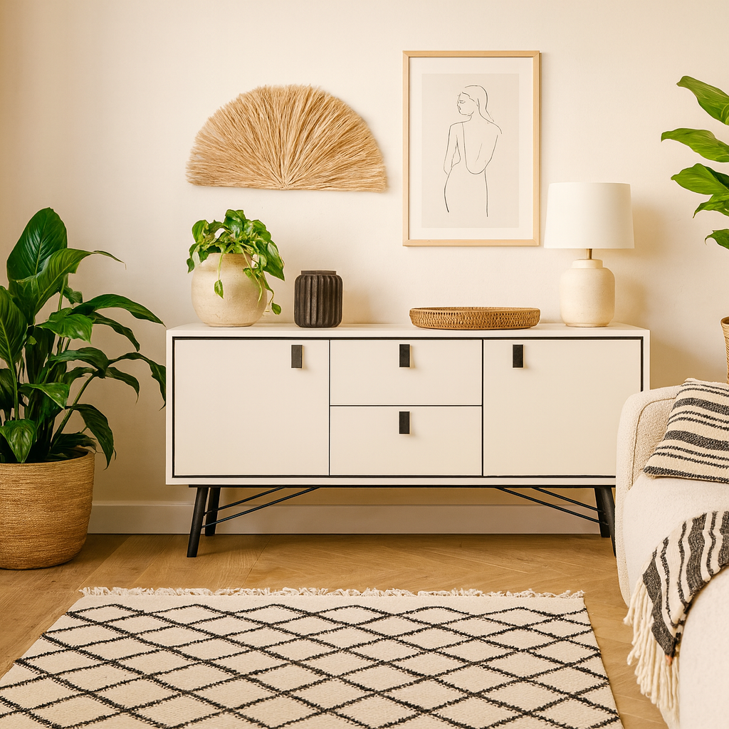 This matt white sideboard brings a clean and versatile presence to any room, offering a calm minimalist mood that blends easily with modern organic interiors. The pair of drawers and two cupboards create effortless organisation while keeping the look bright and understated. Its smooth finish works beautifully alongside natural woods, soft textiles, earthy tones, and rich keywords that shape contemporary crafted spaces.
