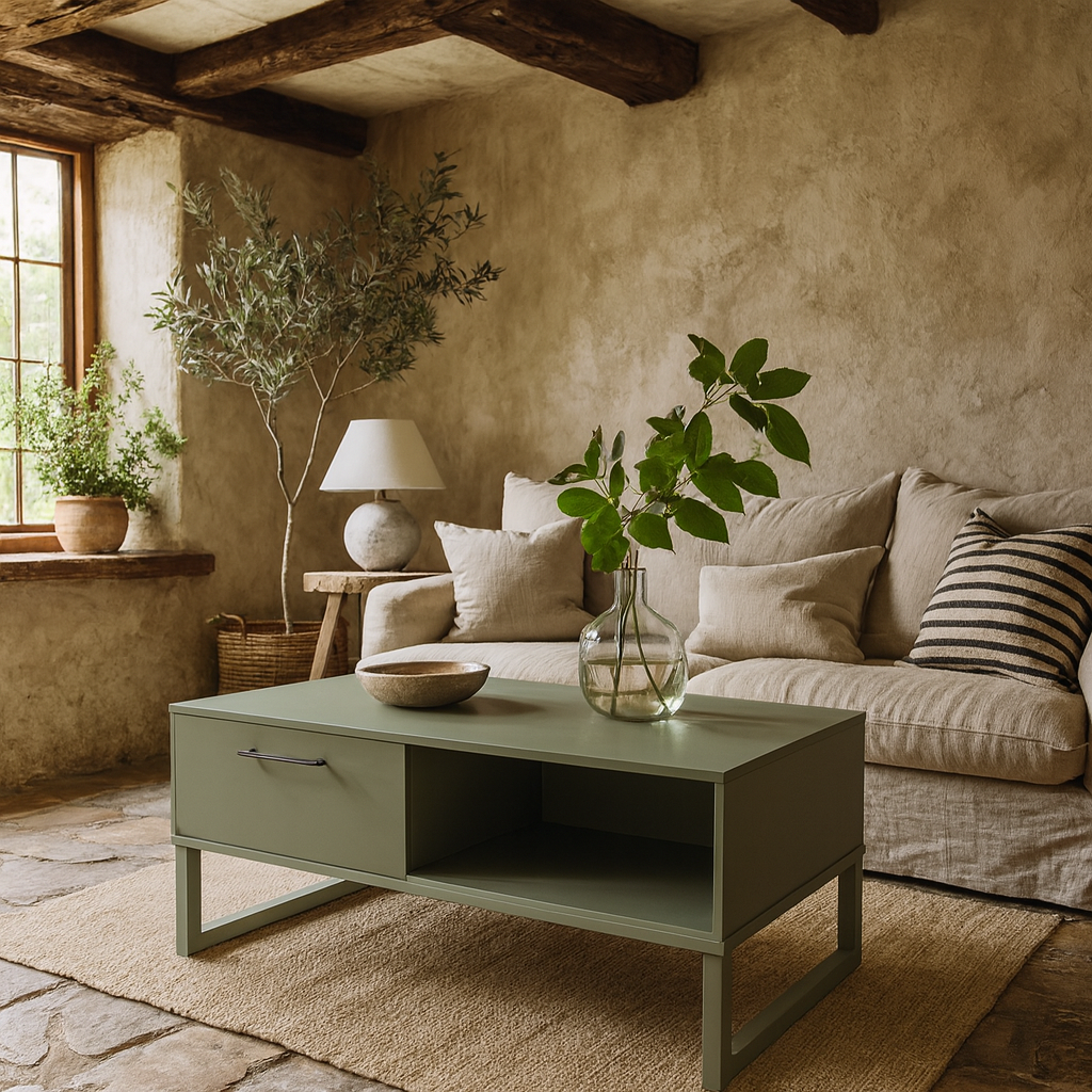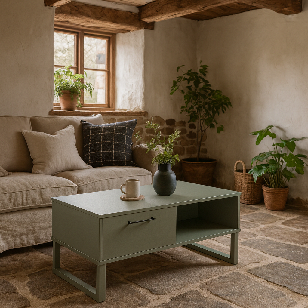This sage green coffee table brings a gentle calming mood to the living space, offering a mix of open display and discreet storage in a relaxed modern form. The colour feels earthy and atmospheric, blending with minimalist rooms, Scandinavian inspired spaces, and rustic organic interiors filled with natural textures and rich keywords. Its drawer and open shelf keep everyday pieces close to hand while maintaining a tidy and curated look that feels effortlessly grounded.