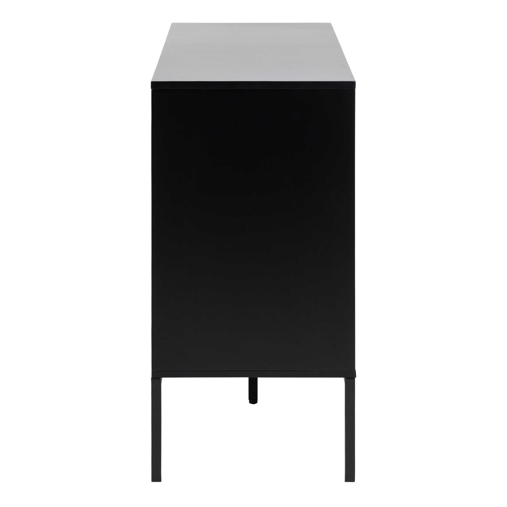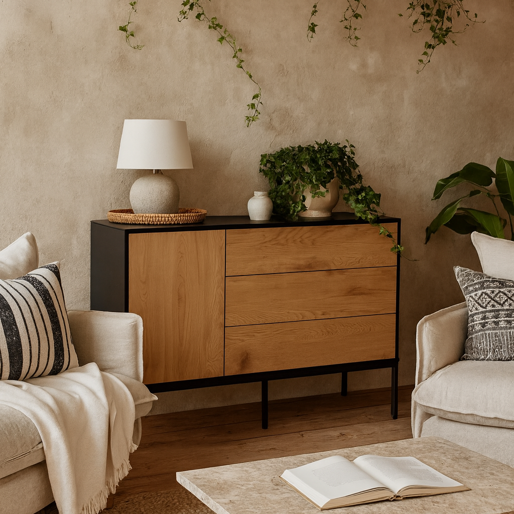 This Sideboard brings minimalist elegance into a living or dining space with its black painted top and frame paired with matte wild oak effect doors and drawers. The contrast between deep black tones and warm timber texture creates a calm and modern presence that works beautifully alongside organic décor, linen textiles, ceramics, faux plants and artificial greenery. The integrated black laminate shelf and matte black powder coated steel base anchor the design with strength and refined industrial character.