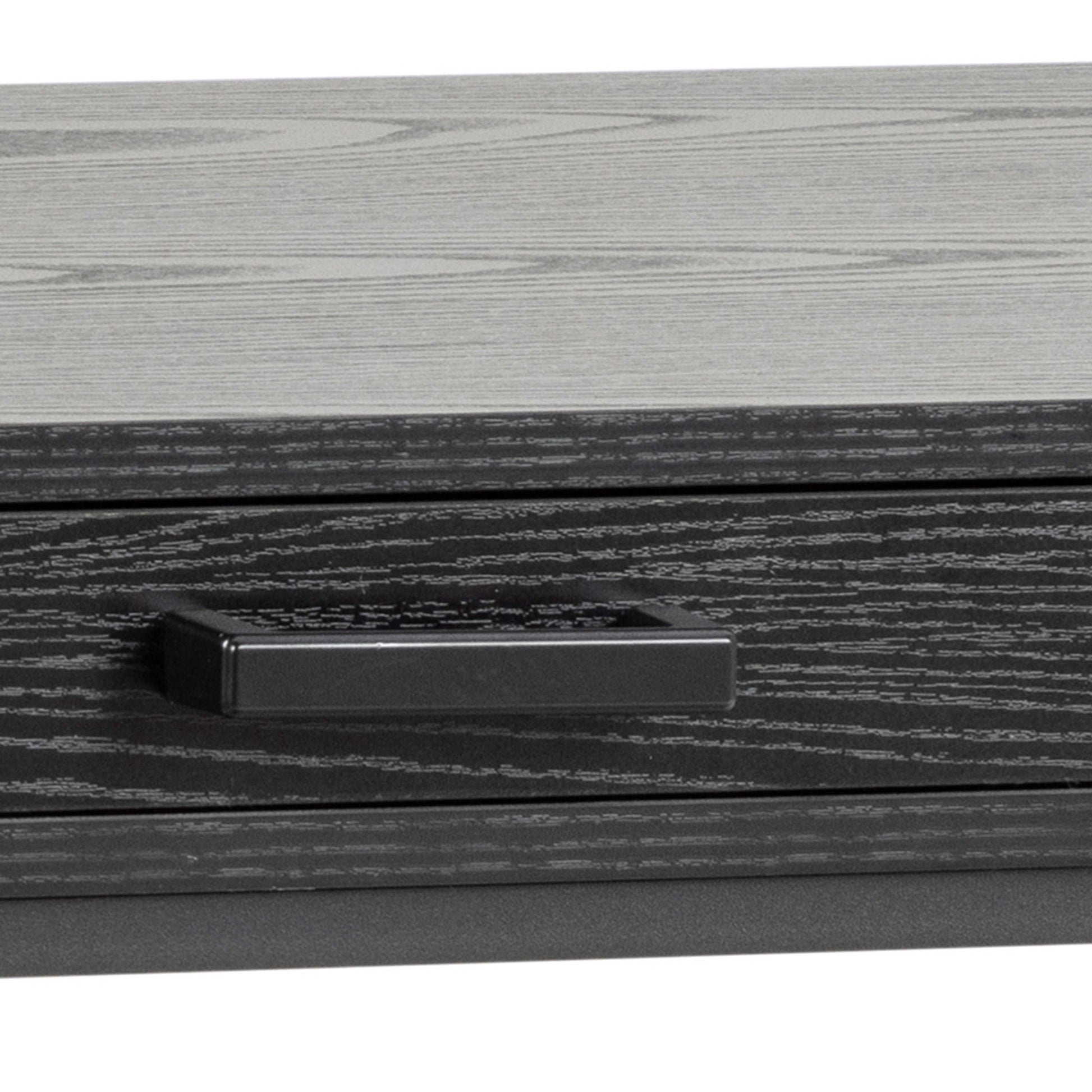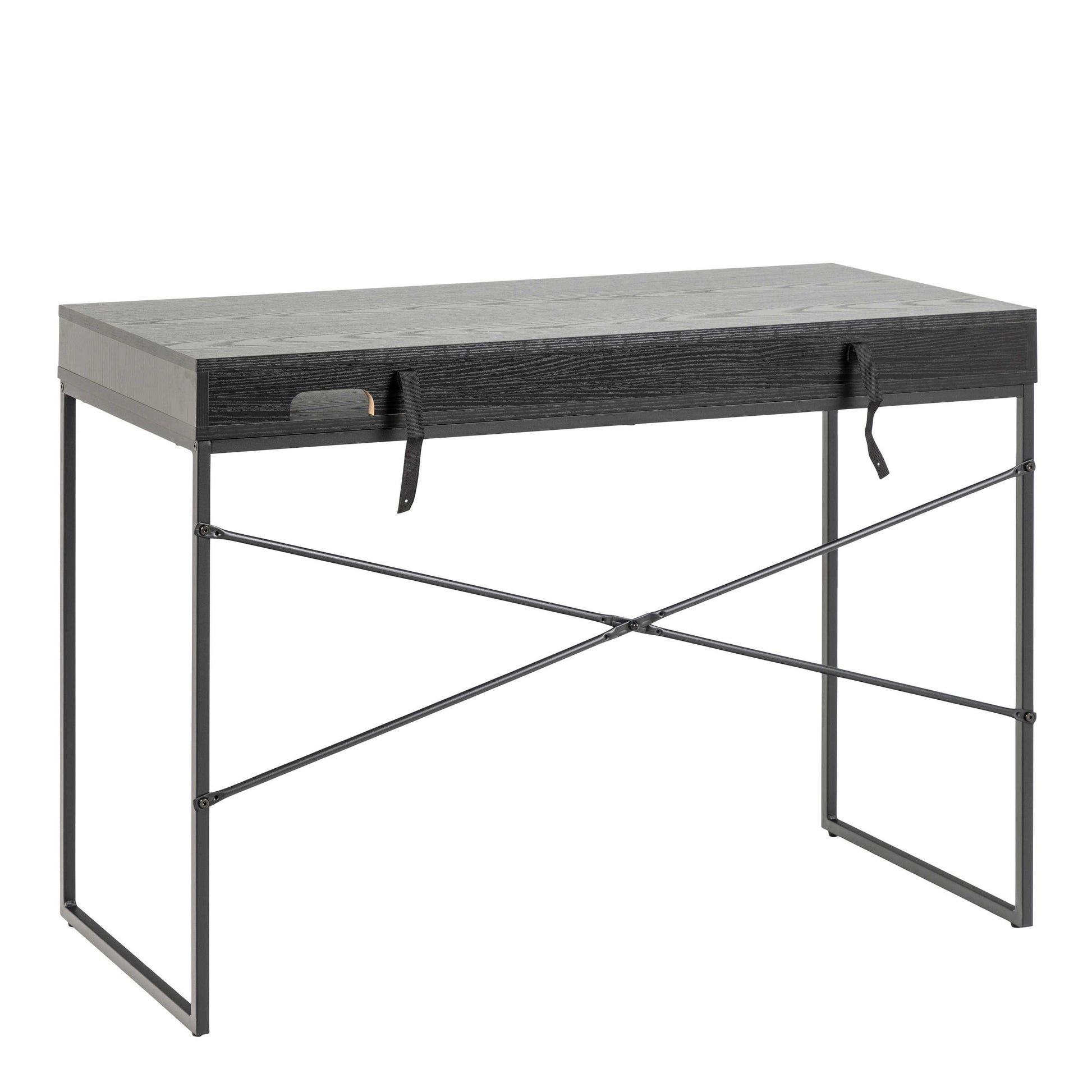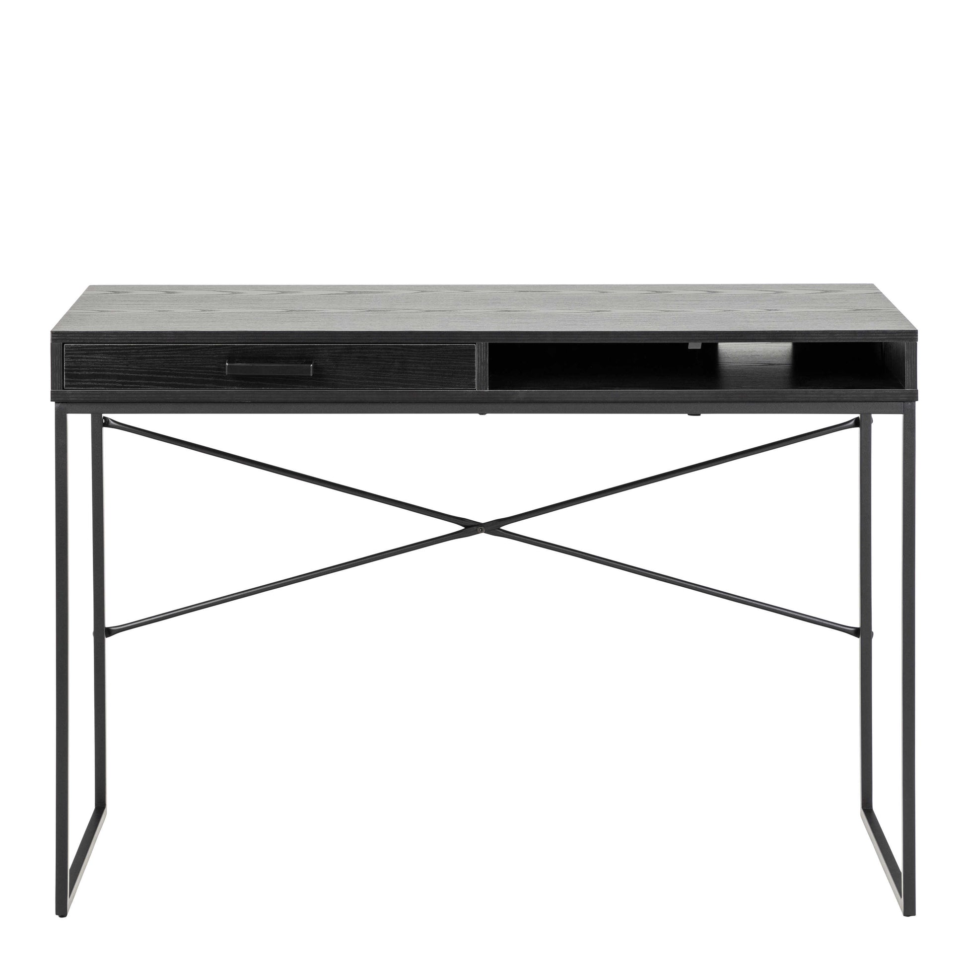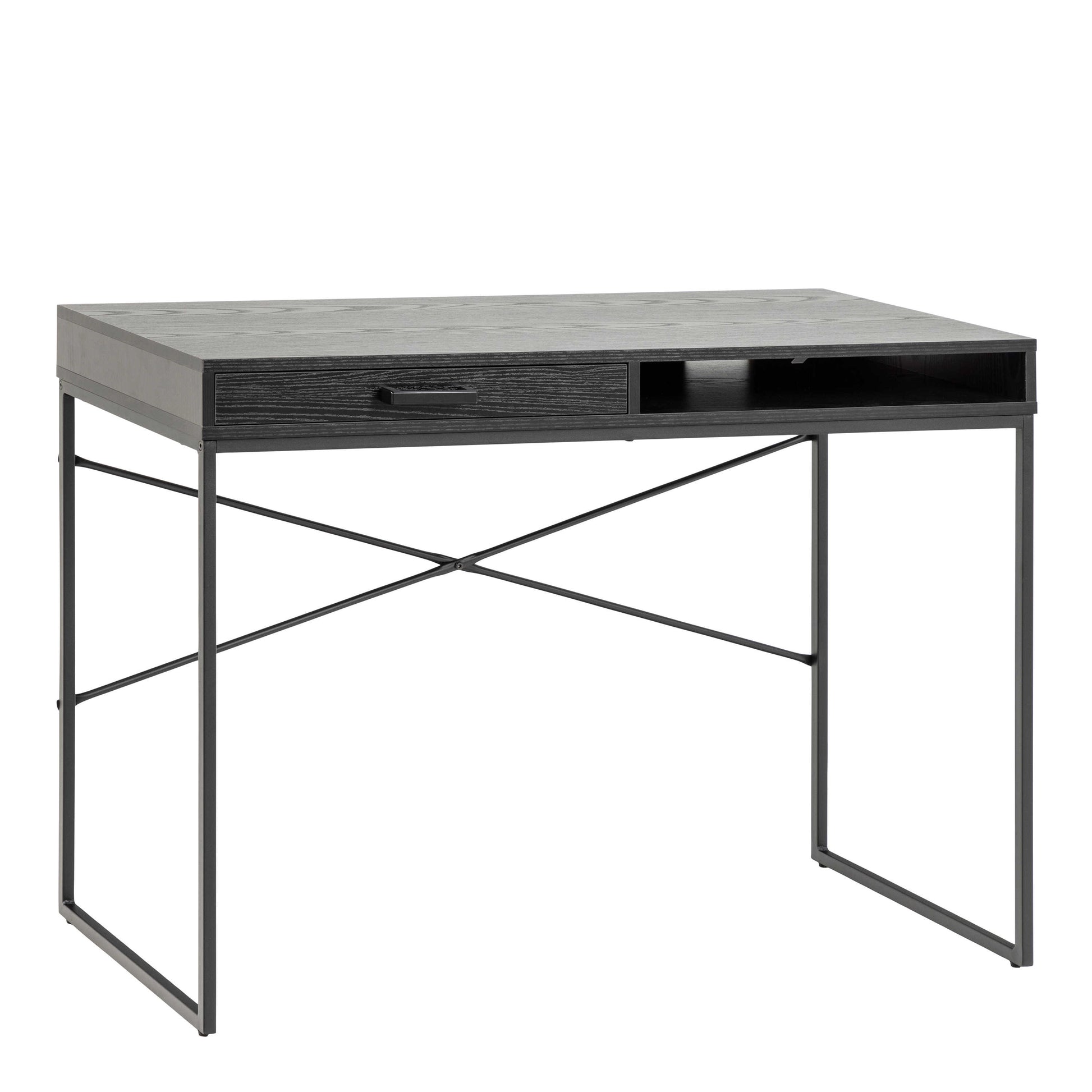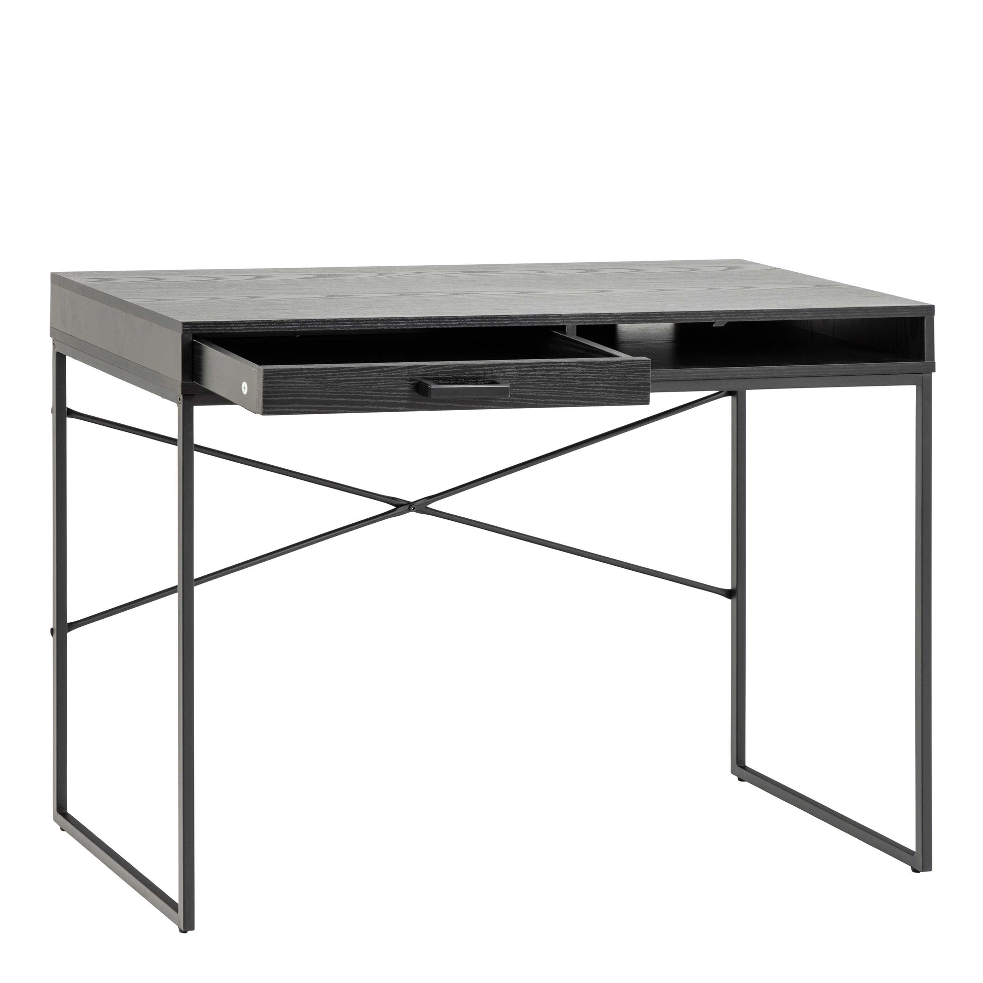This Desk brings a contemporary and grounded feel to a workspace, shaped with an black laminate surface and drawer paired with a matte black powder coated sledge base. The warm timber tone softens the industrial frame, allowing this design to settle naturally among organic décor, linen textiles, ceramics, faux plants and artificial greenery. The open compartment and integrated wire hole keep the area organised, creating a clean and calm environment for focused work.