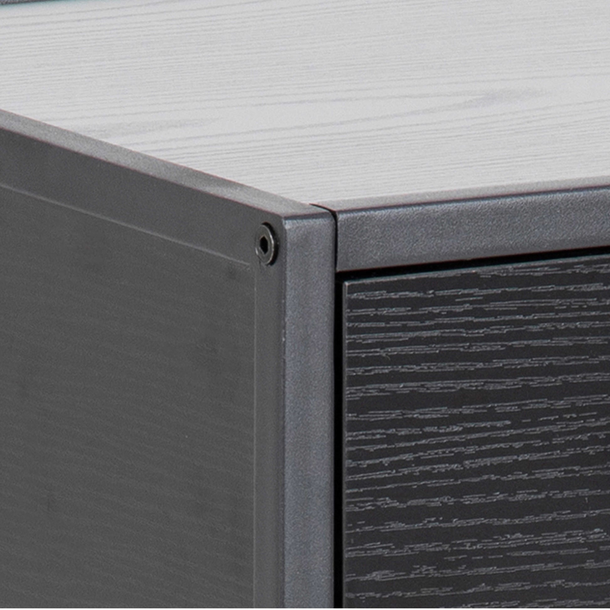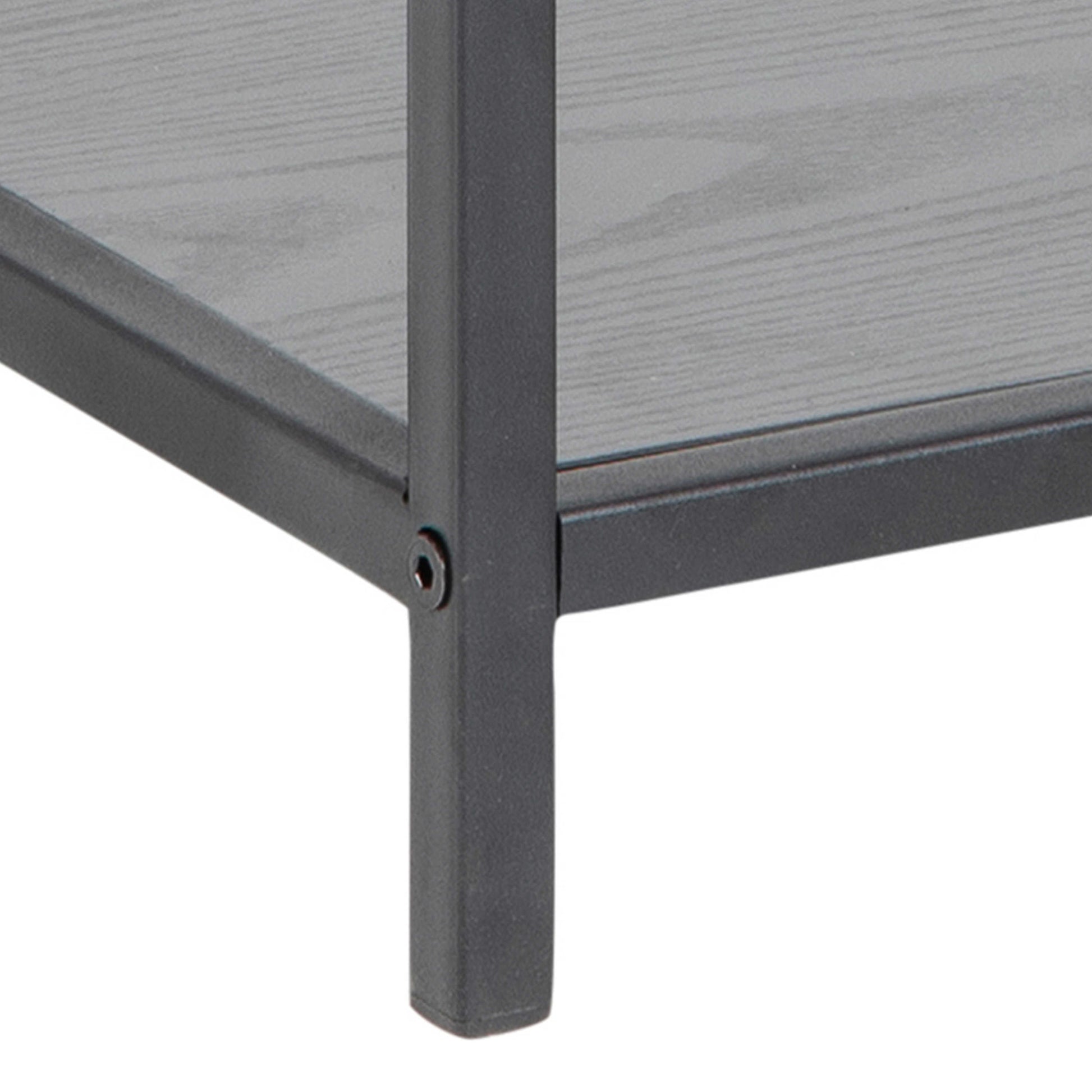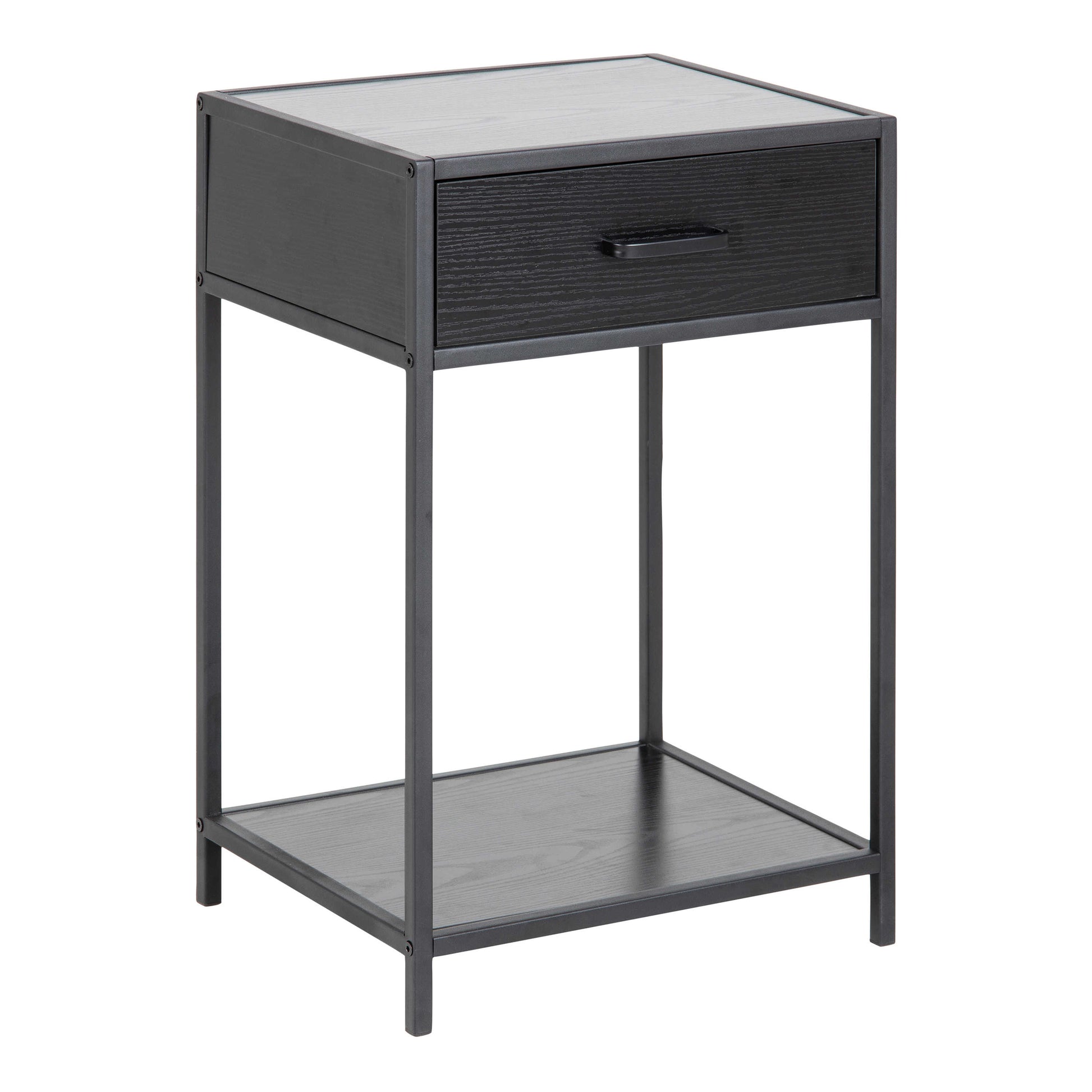 This Bedside Table brings modern elegance to a bedroom with its ash black laminate top, drawer and shelf set against a matte black powder coated steel base. The combination of deep timber tones and a grounded metal frame creates a balanced look that pairs naturally with organic décor, linen textiles, ceramics, faux plants and artificial greenery. The rectangular form offers a contemporary profile that suits Scandi inspired, rustic organic and industrial interiors.