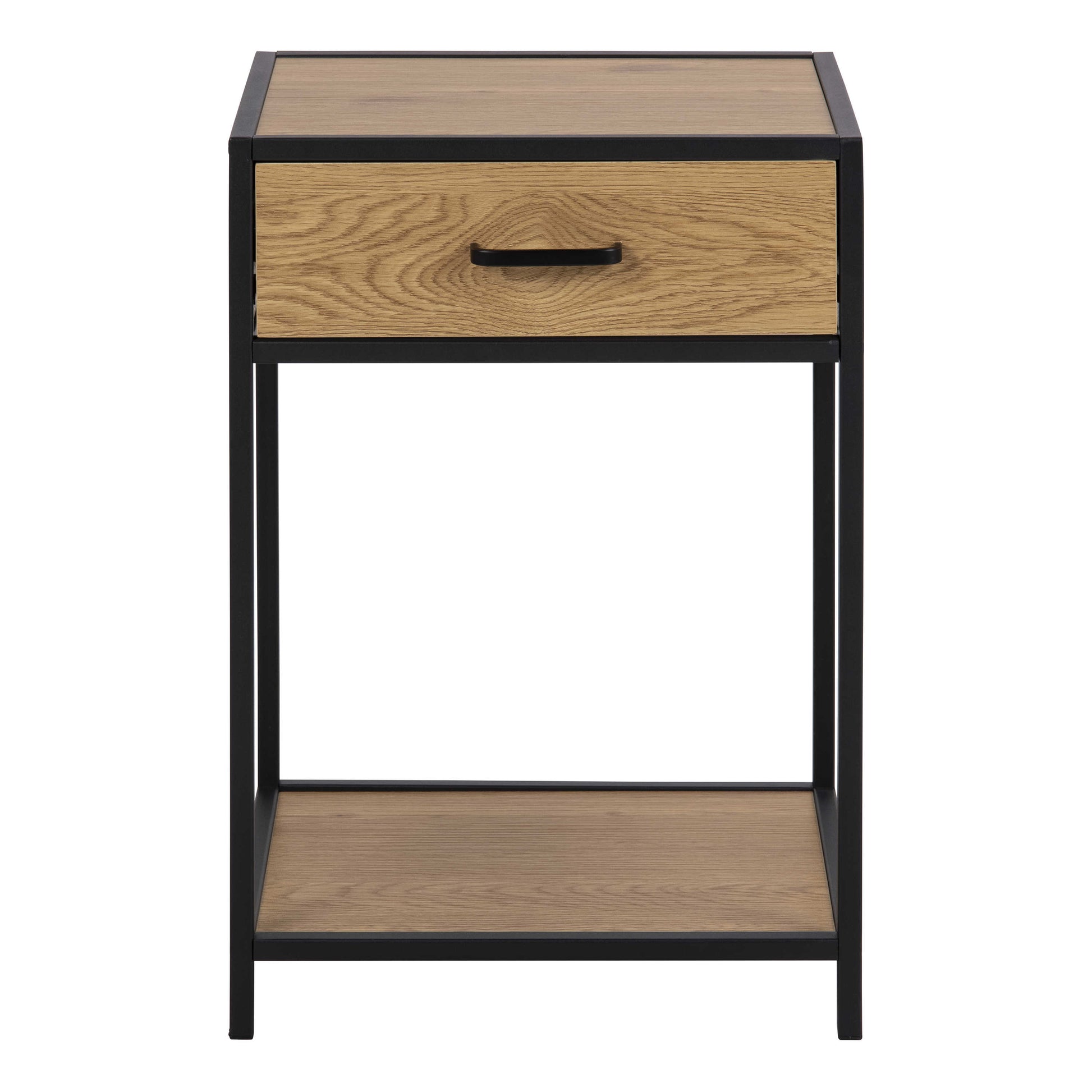 This Bedside Table brings a warm rustic note to a bedroom with its matt wild oak effect top, drawer and shelf set above a sturdy matte black powder coated steel base. The natural timber tone contrasts softly with the industrial frame, creating a balanced look that pairs beautifully with organic décor, linen textiles, ceramics, faux plants and artificial greenery. The rectangular form offers a modern profile that fits comfortably beside a bed in contemporary, Scandi inspired or rustic organic interiors.