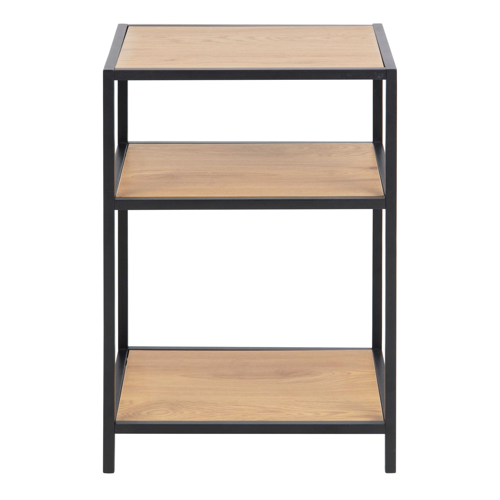 This Bedside Table brings a modern industrial note to a bedroom with its matt wild oak effect top and two matching shelves set above a matte black powder coated steel base. The natural timber tone softens the dark frame, creating a balanced look that pairs beautifully with organic décor, linen textiles, ceramics, faux plants and artificial greenery. The rectangular form offers a clean and contemporary presence beside a bed, making this design an easy fit for Scandi inspired, rustic organic or modern interiors.