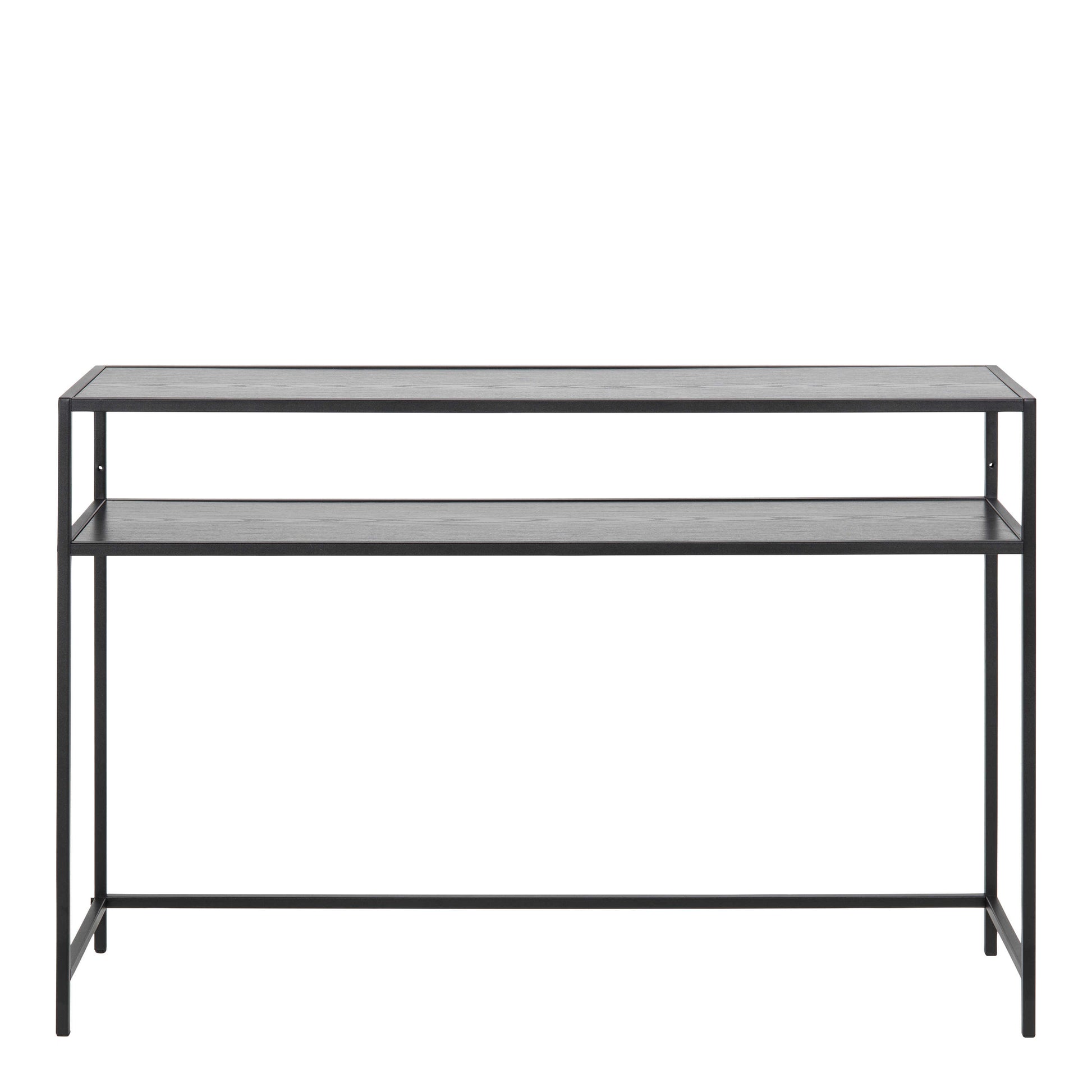 This Console Table introduces a refined and contemporary feel to a room with its ash black laminate top and shelf set on a matt black steel base. The simple structure and calm palette allow this piece to blend naturally with organic décor, linen textiles, ceramics, faux plants and artificial greenery. The open layout keeps the design feeling light, making it a versatile addition to hallways, living rooms or open plan spaces where a balanced surface is needed.