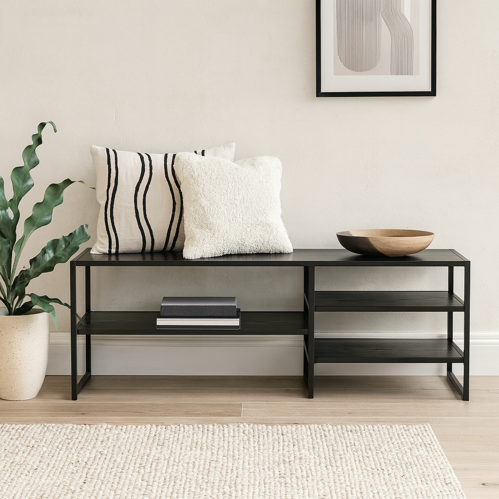This TV Unit brings a contemporary edge to a media room with its ash black top and shelves set within a matte black steel frame. The asymmetrical layout adds movement and visual interest, creating a sculptural silhouette that complements organic décor, ceramic accents, linen textiles, faux plants and artificial greenery. The open back allows devices to sit neatly while keeping cables accessible, making this design both functional and expressive in modern or Scandi inspired interiors.