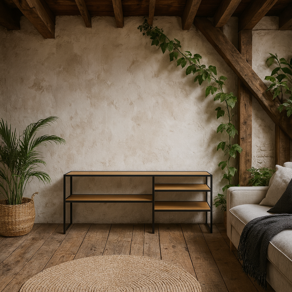 This TV Unit introduces a fresh balance of rustic warmth and modern structure, shaped with matt wild oak effect shelves set within a matt black steel frame. The asymmetrical arrangement creates movement and visual interest, allowing devices, books and decorative pieces to sit comfortably without overwhelming the room. The natural oak tones pair beautifully with organic décor, linen textiles, ceramics, faux plants and artificial greenery, making this design a strong fit for contemporary, Scandi inspired and rustic organic interiors.