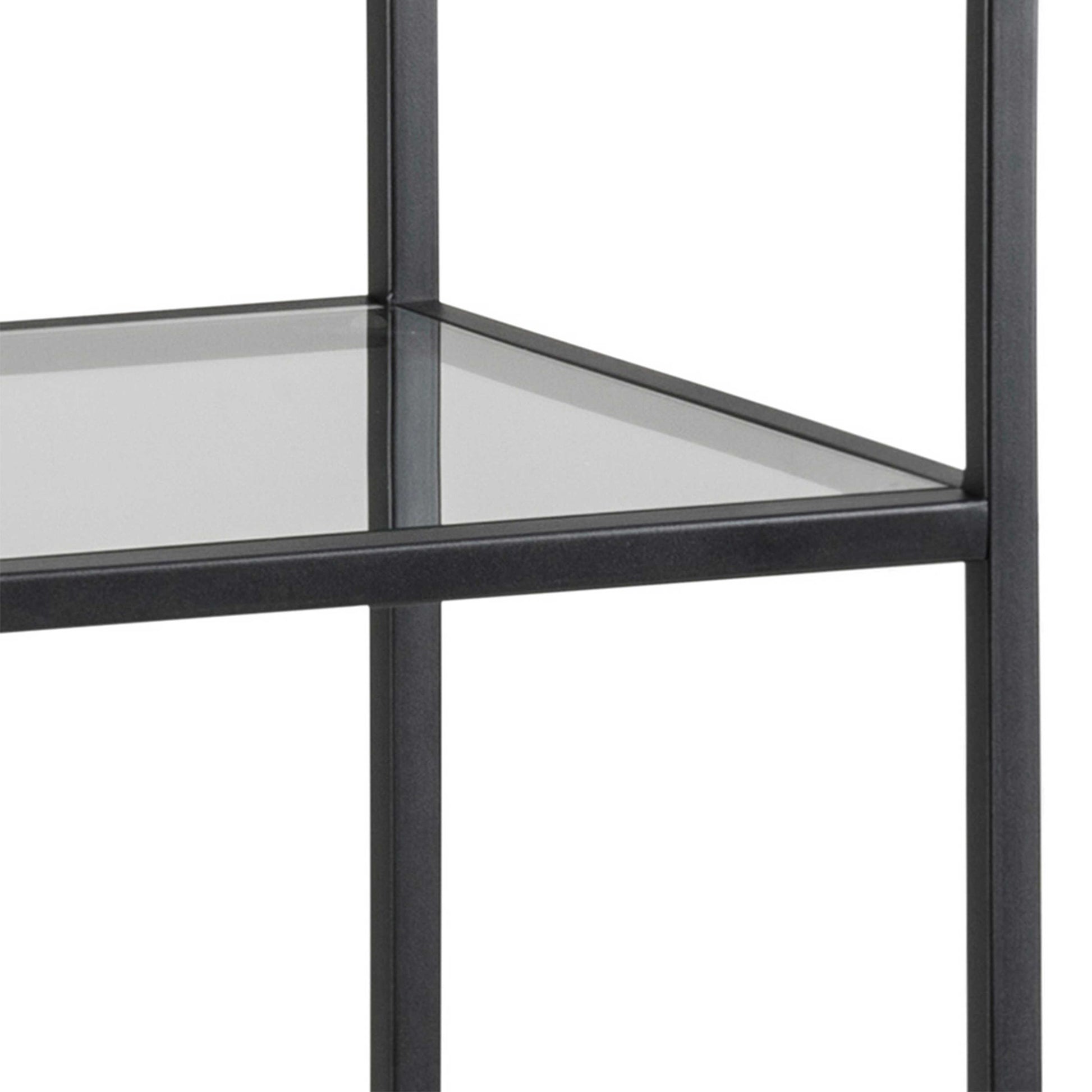 This Bookcase brings a refined sense of modern simplicity to a room with its matte black steel frame and three tempered glass shelves, two in clear glass and one in frosted black. The mix of transparent and smoked surfaces keeps the design feeling light and contemporary, offering a clean stage for books, ceramics, ornaments or touches of faux plants and artificial greenery. The open form pairs effortlessly with organic décor, linen textures and Scandi inspired styling, making this piece a natural fit for living rooms, hallways or home offices.