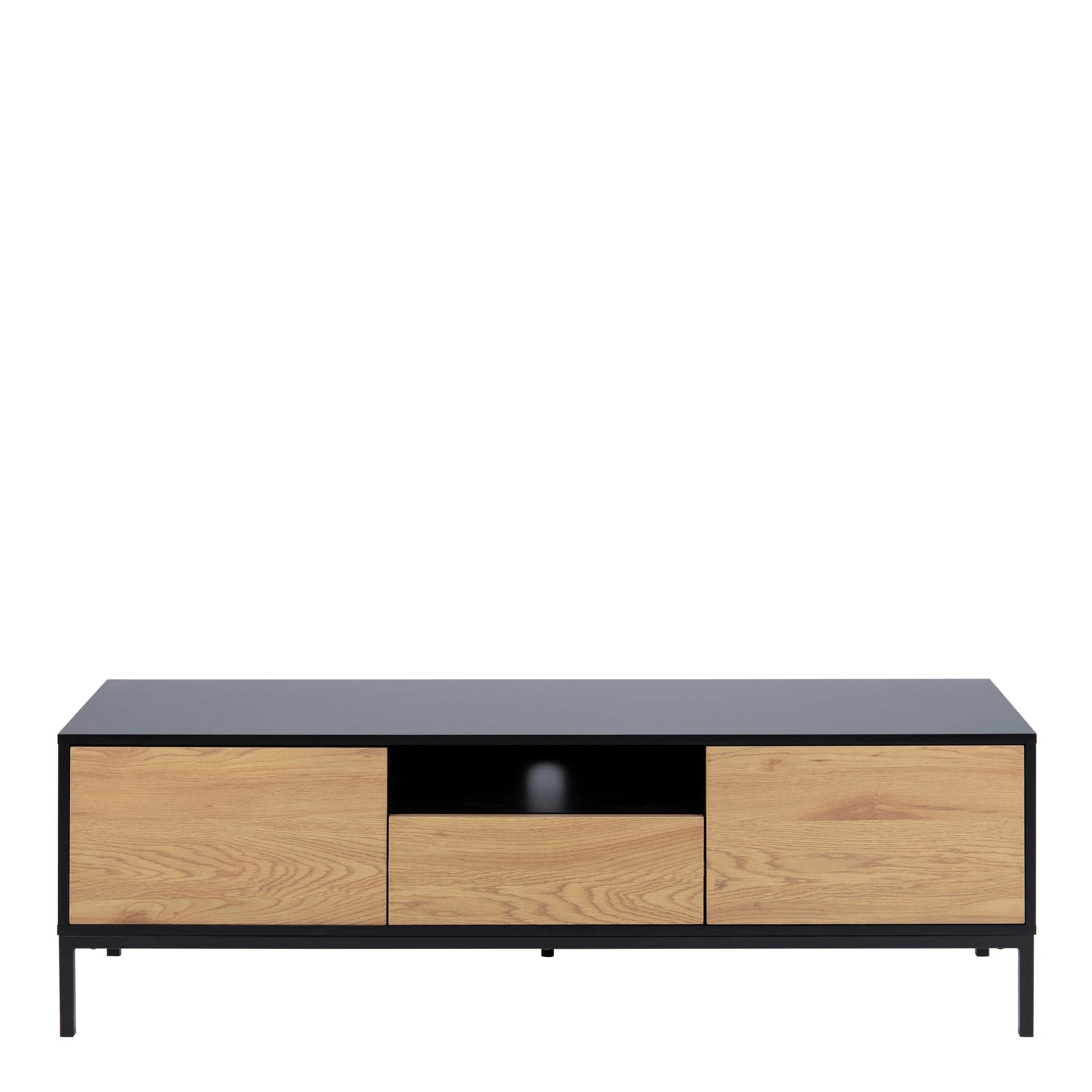 Crafted from carefully selected materials and supported by a sturdy base, this piece features push to open doors, a soft close function and metal runners for smooth drawer action. The wire management system ensures that cables remain tidy, making this unit both practical and visually harmonious. With its clear structure, versatile storage and grounded palette, this design becomes a dependable focal point in the heart of a modern living room.